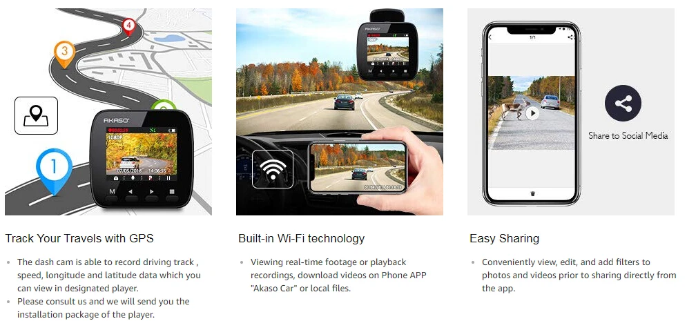 Функция Wi-Fi позволяет соединять видеорегистратор с вашим смартфоном через приложение. После подключения вы можете просматривать, загружать, делить кадры или менять настройки из приложения. Встроенный gps-модуль этого Wi-Fi видеорегистратора показывает скорость, местоположение и маршрут вождения автомобиля на картах Google через приложение или плеер AKASO на вашем компьютере.