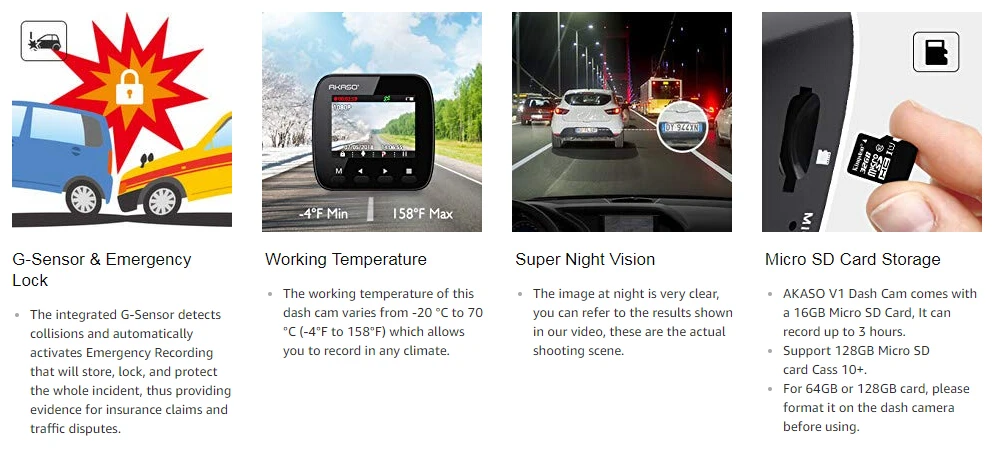 Видеорегистратор AKASO V1, всего на 2 дюйма, занимает меньше места на ветровом стекле, чем большинство. Как одна из самых компактных автомобильных видеорегистраторов, она достаточно мощная, чтобы записывать удивительные видео 1296p (лучшее качество по сравнению с большинством конкурентов, у которых есть FHD 1080p) И закрывает угол обзора 170 градусов перед вами (до 6 полос).