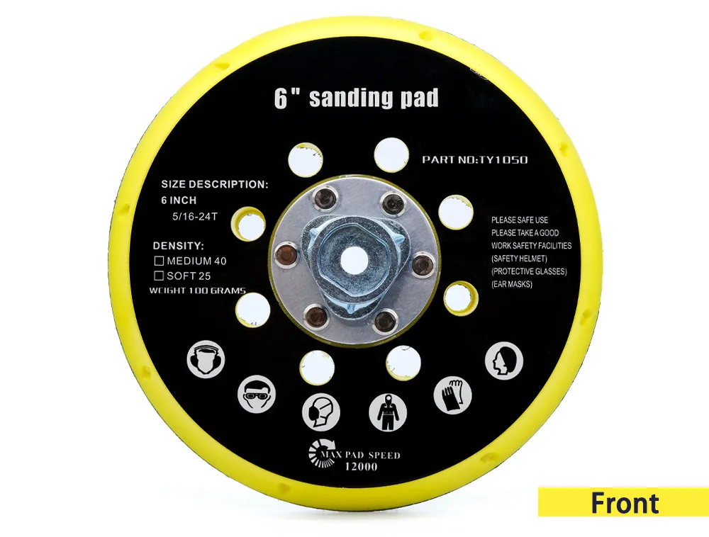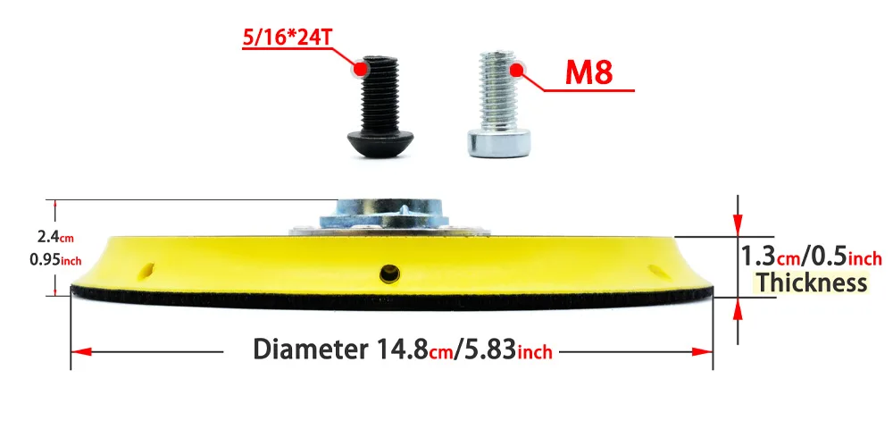 Диаметр: 6 дюймов/150 мм, Материал: полиуретан + липучка + металл Винт: 5/16 ”-24T & M8 Максимальная скорость: 12000 об/мин Посылка: 1 х держатель шлифовального диска 1x5/16 "-24 резьбовой винт 1 x резьбовой винт M8