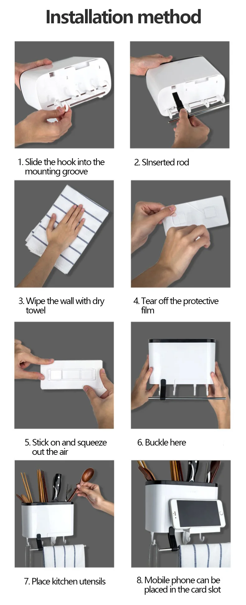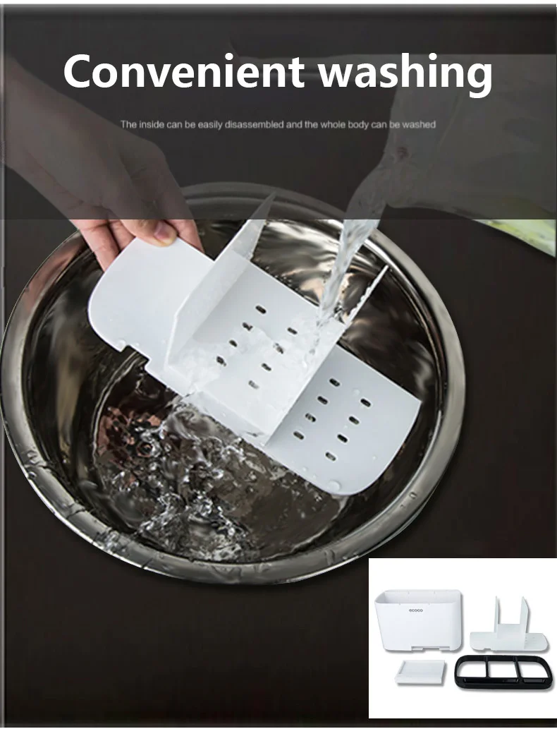 Сильный клей: хорошо прилипает к раковине из нержавеющей стали/кварца/гранита, но выключается без следов или остатков. Выдерживает до 15 кг. Отлично подходит для очистки столешницы и сохранения сухости кисти и губки. Простота Слива: самосливающаяся доска разработана с идеальным шагом, чтобы избежать попадания воды в дренажную доску и снимается для легкой очистки. Многофункциональный: он может держать ножи, народные, губки, совок, ножницы, баклажаны и т. Д.