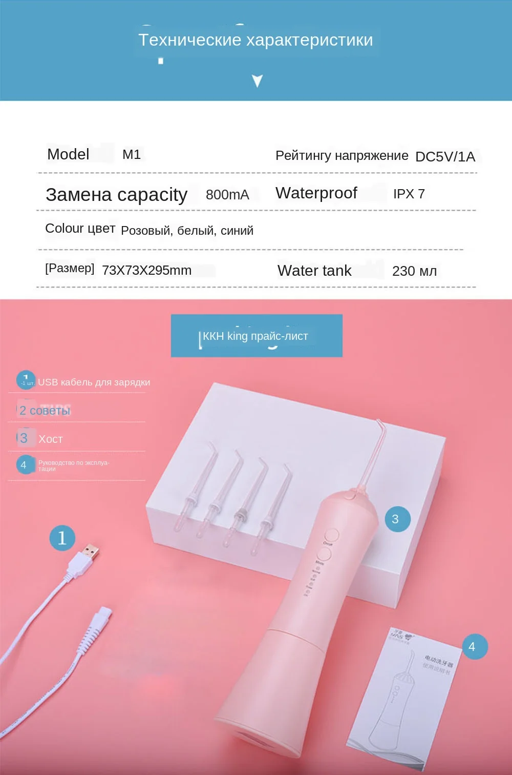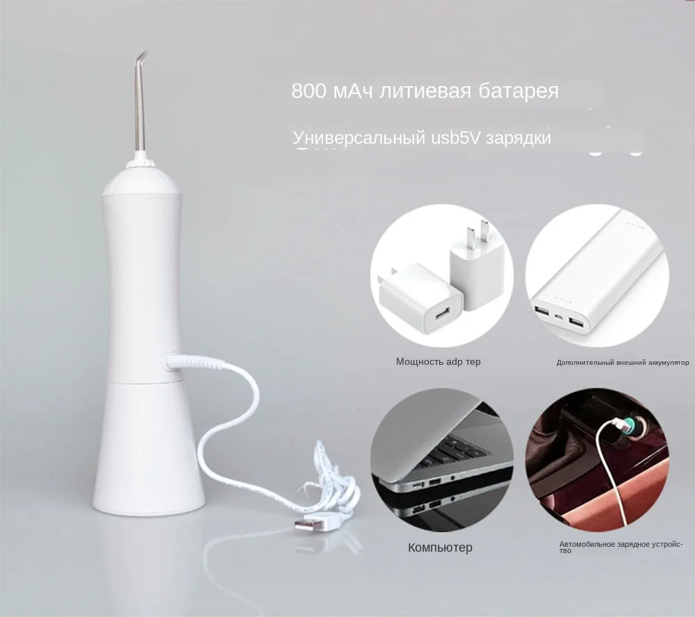 【Большая Емкость 】 800 мАч перезаряжаемая батарея. Эта водяная зубная нить просто требует 4 часов зарядки, которая может длиться 3 недели непрерывного использования; Подходит для путешествий и деловых поездок. 230 мл резервуар для воды подходит для личного использования и не нужно добавлять воду дважды.