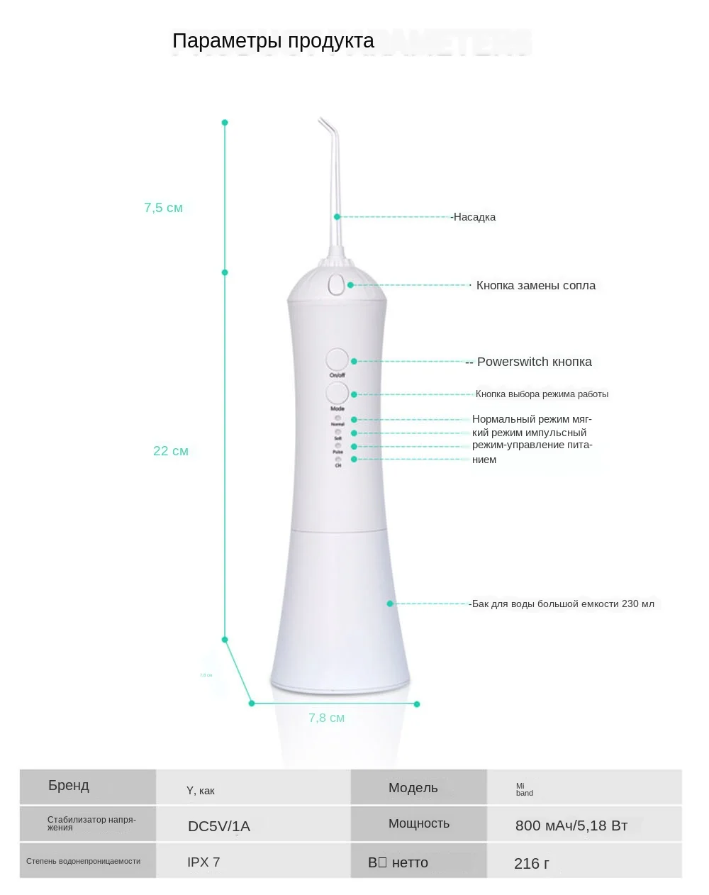 Цвет: белый/синий/розовый Емкость резервуара для воды: 230 мл Размер изделия: 73 мм * 73 мм * 295 мм Водонепроницаемость: IPX7 Материал: ABS POM Номинальное напряжение: DC5V / 1A Номинальная мощность: 800 мАч/5,18 Вт · ч Встроенный аккумулятор: литиевая батарея 800 мАч Давление воды: 90-110PSI Режим смыва: Нормальный/мягкий/импульсный Время зарядки: около 2,5 часов Выносливость: один раз в день около 18 дней Способ зарядки: зарядка через USB