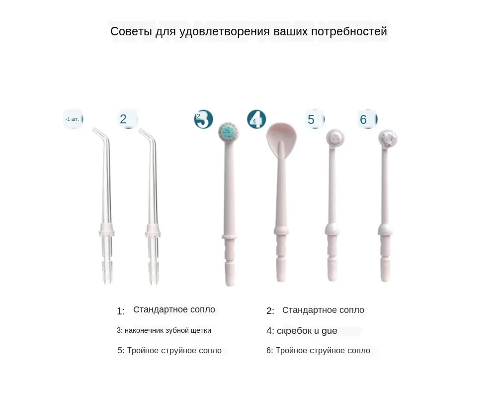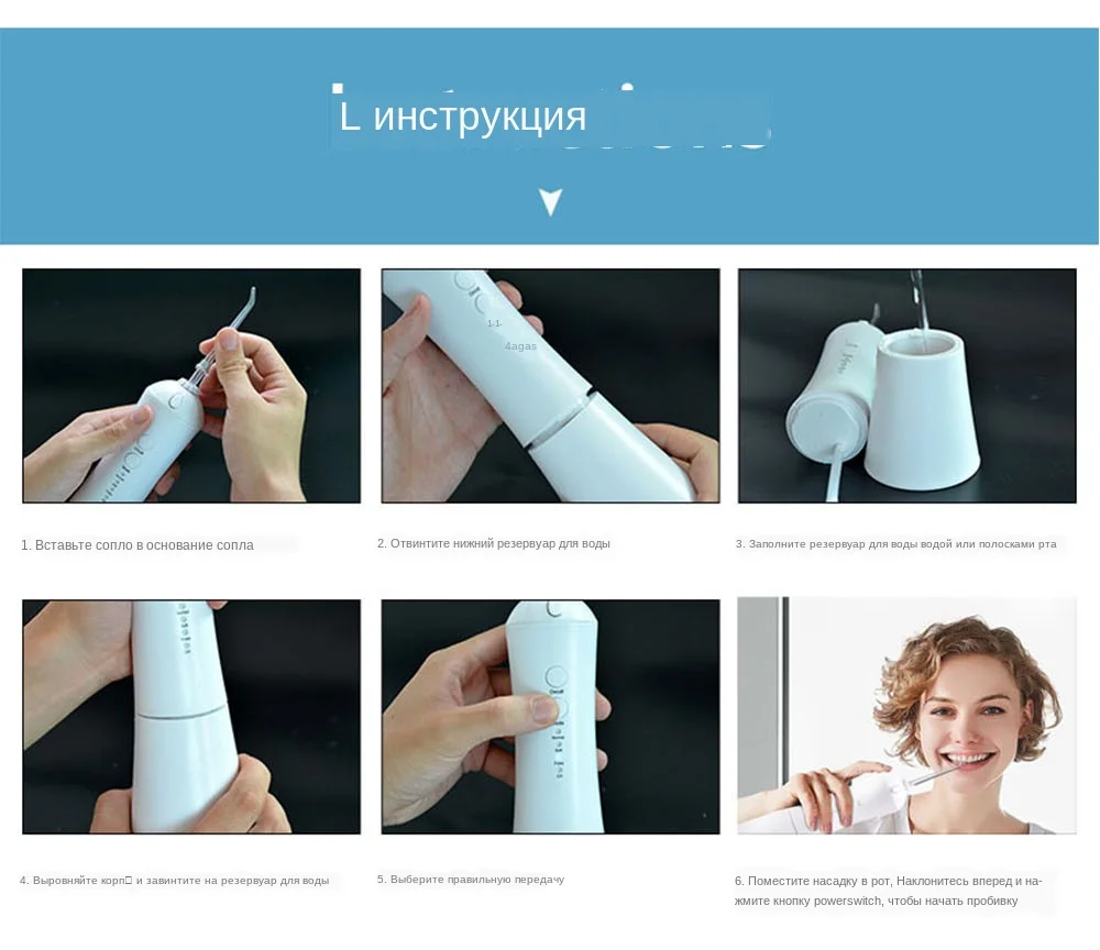 1 x ирригатор для полости рта 1 x USB линии 3 ~ 7 x насадки для воды 1 х руководство на английском языке Теплые советы: 1. Если вы хотите использовать с водой, полосками для полоскания рта или антибактериальными полосками, Следуйте рекомендациям вашего стоматолога или гигиениста. 2. Не используйте другие зарядные устройства для зарядки