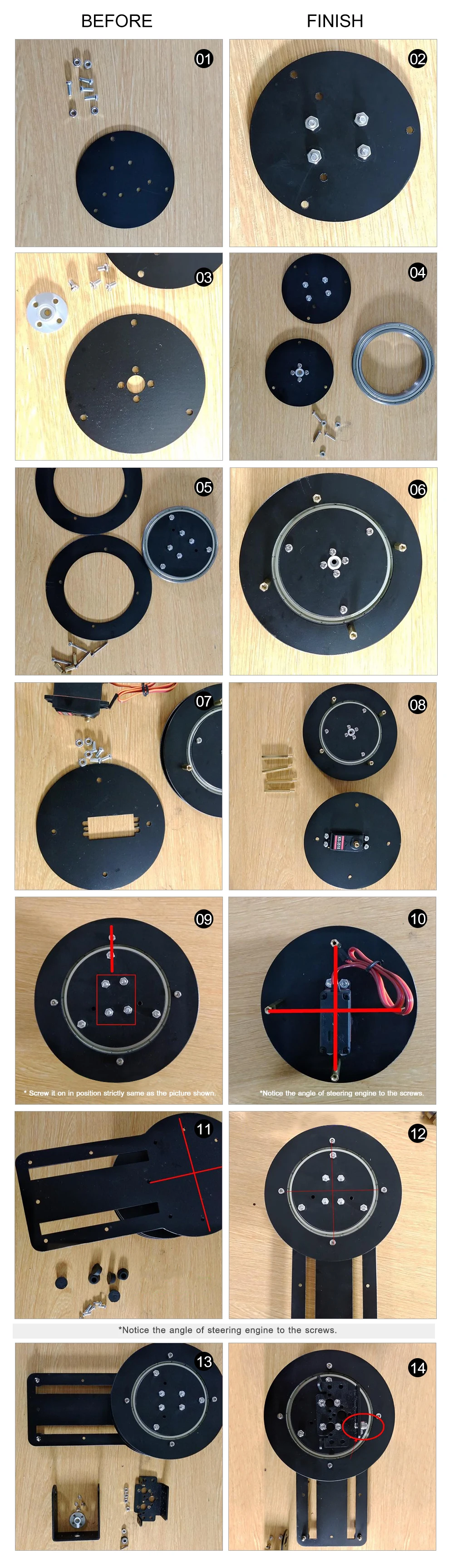 [Гибкая вращающаяся основа на 360 °]Использование подшипника круглого диска и медного цилиндра работает как Королевская башня для защиты рулевого двигателя от большой нагрузки, а основание держателя может поворачиваться на 360 градусов, которые делают руку более гибкой и более продолжительной серийной.