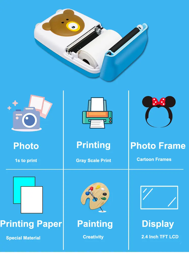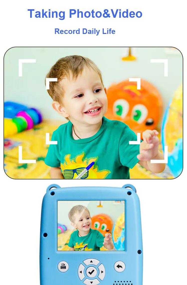 * Видео: 1920*1080 * Фото: 4032*2880; 4032*2520;3800*2160 1920*1080; 1280*720 * 2,4 ''TFT экран Разрешение печати: 200DPI * Емкость аккумулятора 1000 мАч * Оптический зум: фиксированный фокус * Поддержка tf-карты до 32G * Функция: фото + видео + фото печать