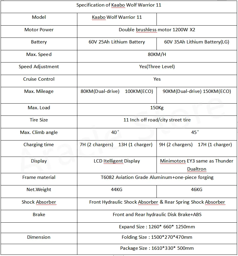 Модель: Wolf Warrior 11 Мощность двигателя: двойной бесщеточный двигатель 1200 Вт X2 Батарея: 60V 25Ah литий Батарея/60В 35Ah литий Батарея (LG) Максимальная скорость: 80 км/ч Максимальный диапазон: 100 км (режим ECO) 80 км (режим Dual-drive) / 150 км (режим ECO) 90 км (режим Dual-drive) Материал оправы: авиационный алюминий T6082 + цельная ковка Тормоз: передний и задний гидравлический дисковый тормоз + ABS Амортизатор: передний гидравлический амортизатор и задний пружинный амортизатор Шины: 11 дюймов внедорожные шины/уличные шины CST шины Вес нетто: 44 кг/46 кг Размер расширения: 1260x660x1250мм Размер складывания: 1500x270x470мм Размер посылка: 1610x330x500мм