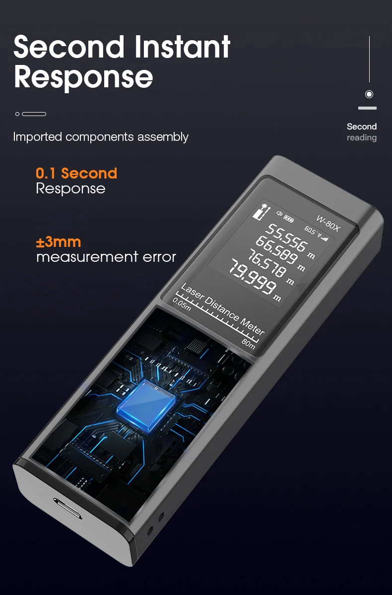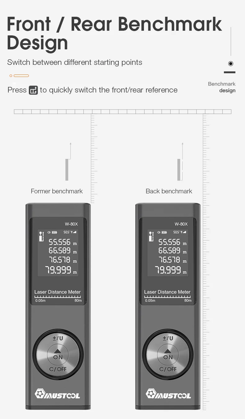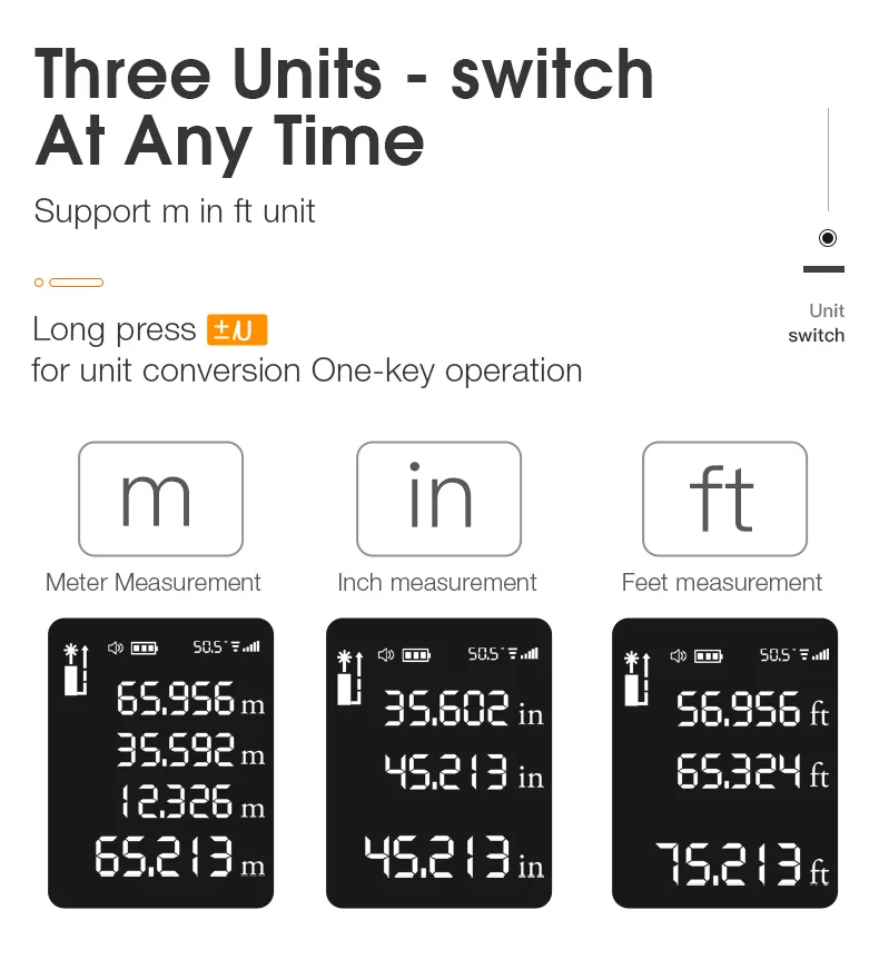 ★Высокая точность: Благодаря технологии лазерной точности, точность ups до ± 1 мм, расстояние измерения увеличивается до 80 м; Переключается между M/In/Ft для свободной регулировки