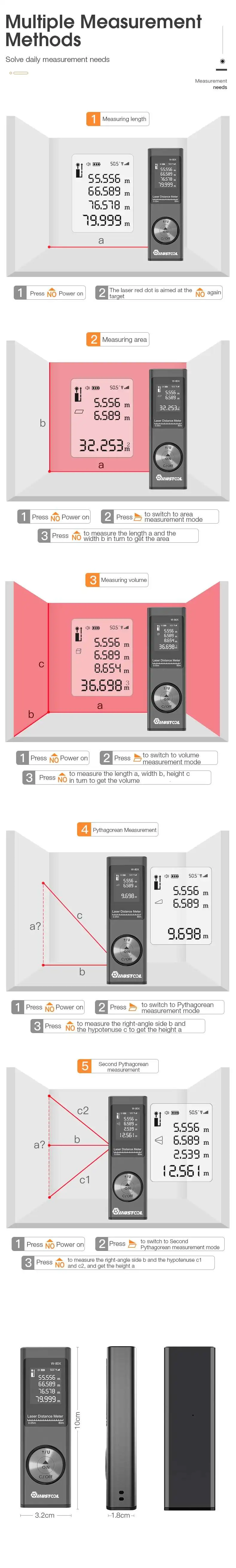 ★Несколько функций измерения: Площадь, расстояние, длина, объем, непрерывное измерение, метод по пифагору-три точки; Сложение и вычитание; Индикация низкого заряда батареи; Память данных 20 групп; Вручную удалять данные; автоматическое выключение через 150 с без каких-либо операций для экономии энергии