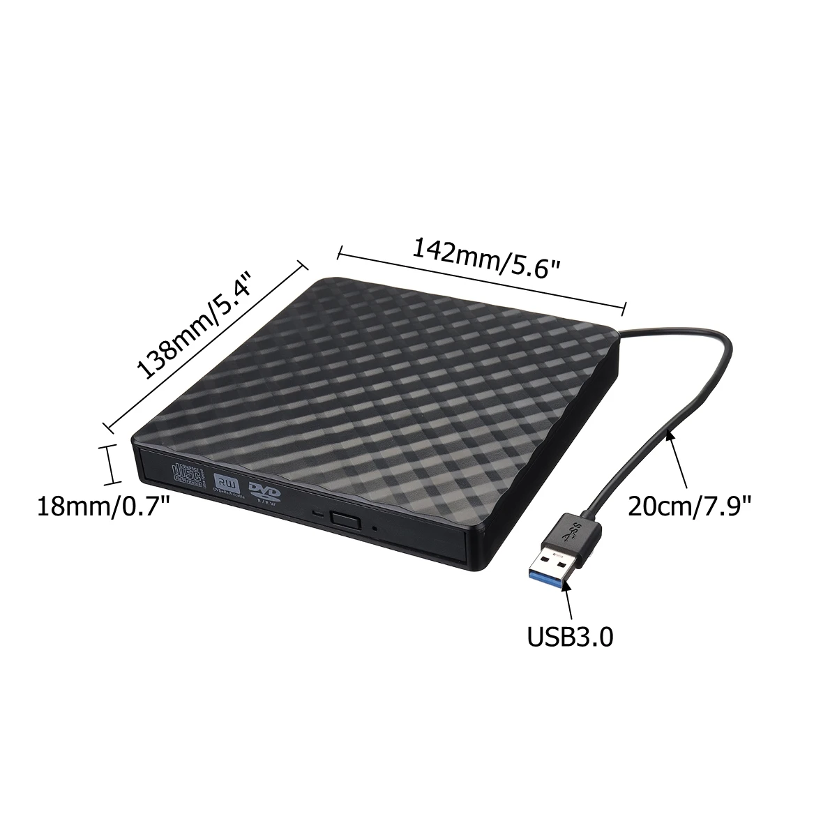 Ультра-тонкий портативный DVD диск, легкий, который удобно использовать и носить как дома, так и в путешествиях, что требует небольшого пространства в сумке. Порт USB 3,0 поддерживает plug and play, совместим с 98% компьютерной системой. Скорость чтения Макс 8x DVD, Макс 24x CD.