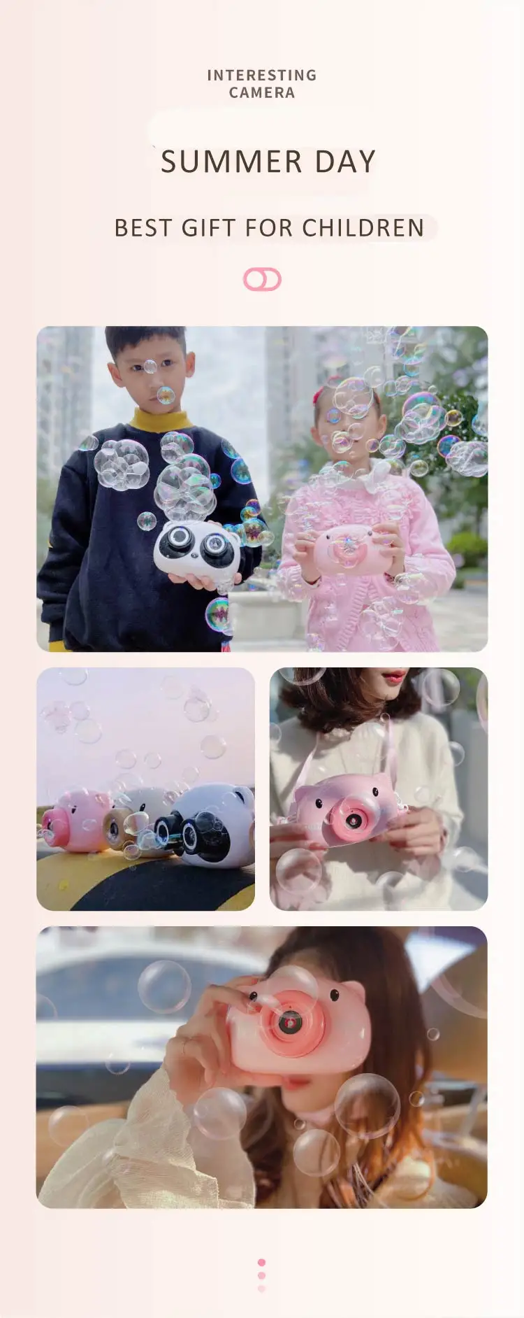 Пузырь Камера Питание: 3 шт. AAA батареи (не входят в комплект) Материал: пластик, АБС-пластик Функция: Автоматическое создание пузырьков одной кнопкой Основные функции: музыка, свет, пузыри Подходящий возраст: 3 года + Посылка список: 1 * мыльных пузырей 1 * брекеты Инструкции по уходу за изделием 1. Вставьте аккумулятор 2. Установите пузырчатую воду 3. Нажмите кнопку переключения, чтобы сделать пузырь.