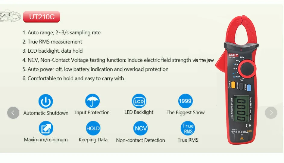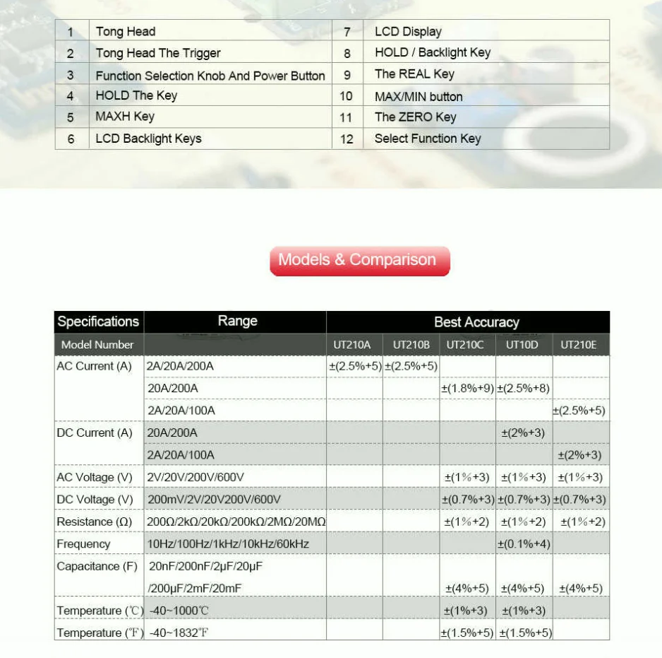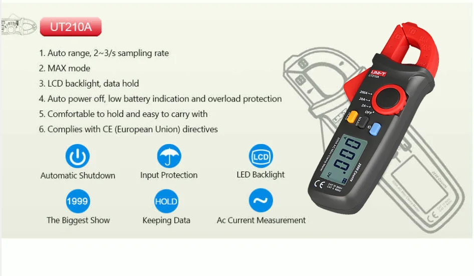 1.UT210A и UT210B поддерживают только ток переменного тока. 2.UT210C поддерживает AC Ток, AC/DC напряжение, сопротивление, емкость, температуру 3.UT210E поддерживает AC/DC ток, AC/DC напряжение, сопротивление, емкость 4. Поддержка UT210D выше всего