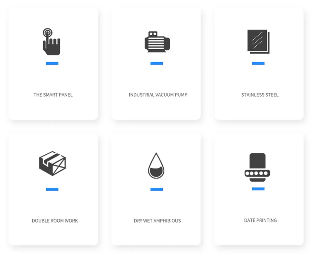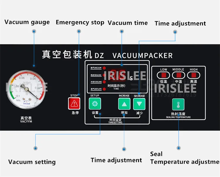 1. Модель: DZ-400-2SA 2. Напряжение: 220 В/50 Гц 3. Мощность двигателя: 2000 Вт 4. Мощность уплотнения: 1200 Вт 5. Размер машины: 990*620*910 мм 6. Максимальное вакуумное давление: 1 кПа 7. Количество уплотнений на камеру: 2 8. Скорость вакуумного насоса: 20 м 3/ч 9. Вес машины: 170 кг 10. Материал вакуумной камеры: нержавеющая сталь