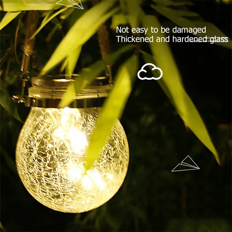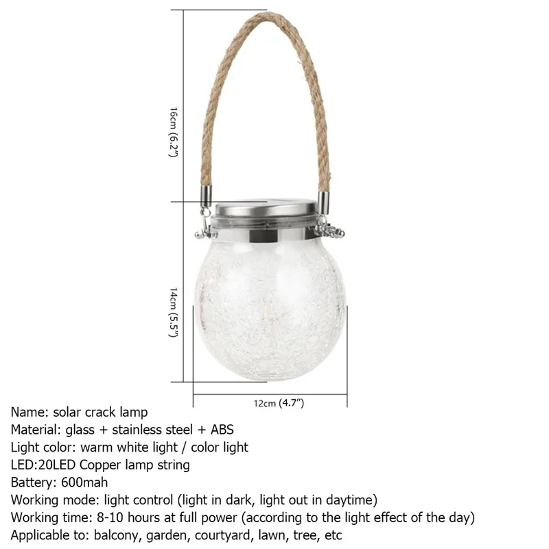 Вопросы и ответы Q1: Клиент: Что делать, если мы не получим товар в течение согласованного времени? Магазин: мы полностью вам компенсируем. Q2: Клиент: Что мне делать? Если он поврежден во время транспортировки? Магазин: во-первых, эта вероятность очень низкая, а во-вторых, Aliexpress полностью компенсирует вам, если вы действительно столкнулись с повреждением во время транспортировки, пожалуйста, будьте уверены. Название: Солнечная трещина лампа Материал: стекло + нержавеющая сталь и АБС-пластик Светильник Цвет: теплый белый светильник/цвет светильник Светодиодный светильник: 20 л ED медь Батарея: 600 мА-ч Режим работы: светильник (светильник в темноте, светильник в дневное время) Время работы: 8-10 часов на полную мощность (в соответствии с светильник эффект дня) Применимо к: балкон, сад, двор, газон, дерево и т. д