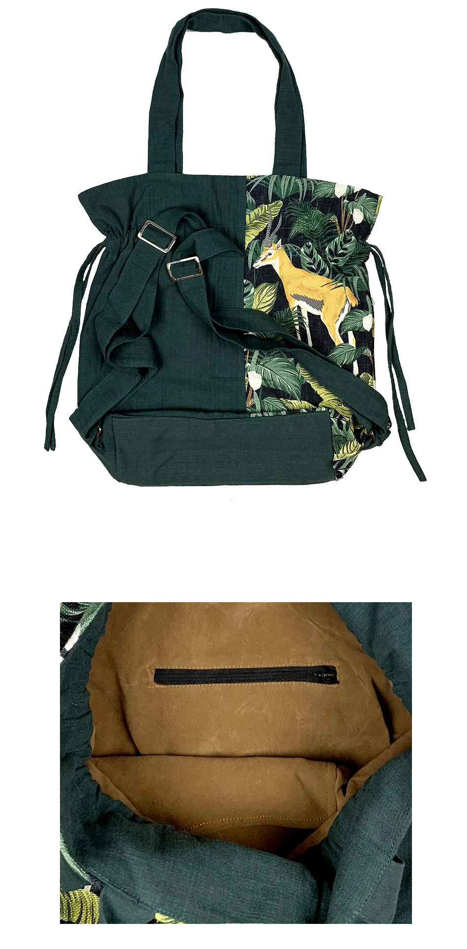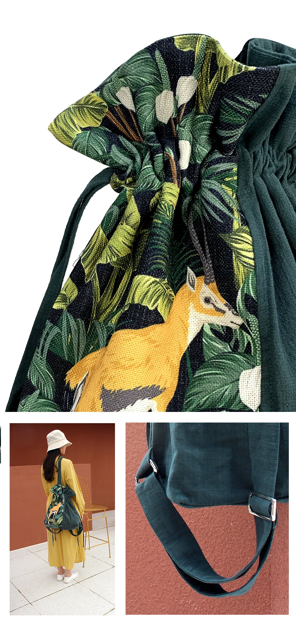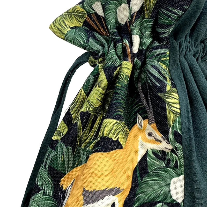 The fabric is made of thickened cotton and linen, which is thick, soft but smooth, does not pilling, does not fade, has a shallow luster in natural light, and the pattern adopts high-definition printing and dyeing process, which makes the pattern lifelike and does not fade. Using drawstring design, easy to use, the back of the backpack using three-layer fixed design to ensure that the bag type remains the same!