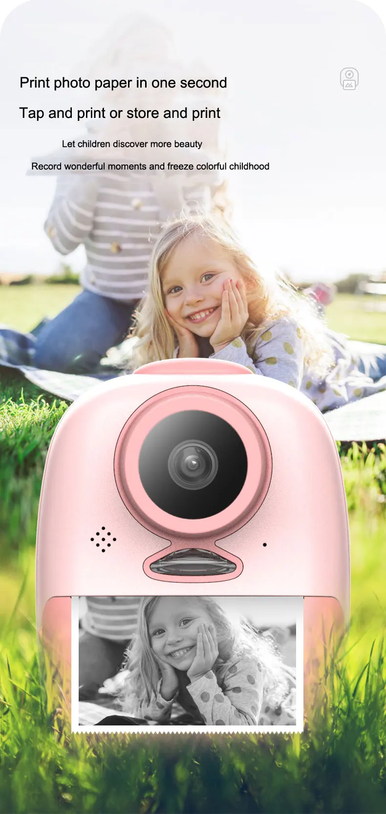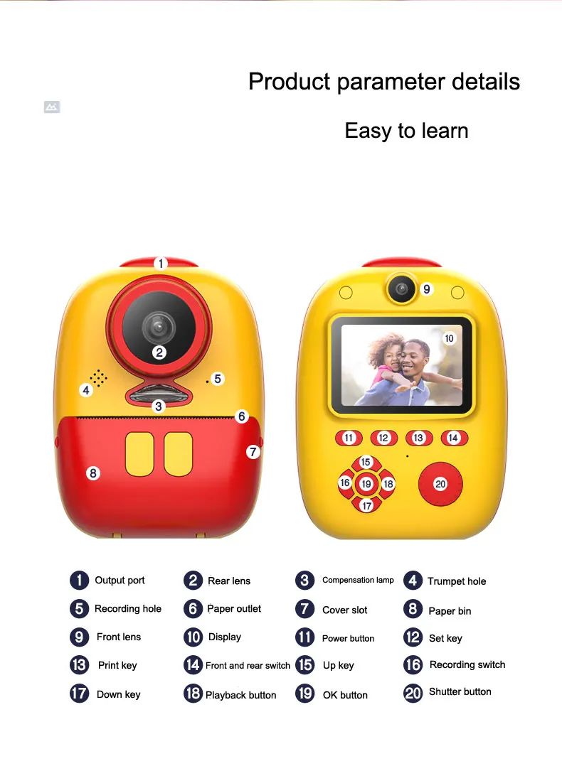 Цвет: розовый, желтый Упаковочный лист: 1 * BC40 камера 1 * usb-кабель для зарядки 1 * Инструкция по эксплуатации 2 * бумага для печати 5 * карандаши 1 * сумка Веревка 1 * ремешок