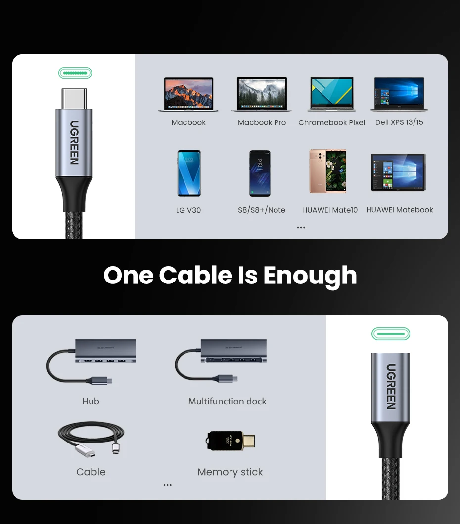 Кабель UGREEN male-female USB C предназначен для расширения соединения между USB-C устройствами из-за ограничения длины или положения, что делает вещи проще и удобнее.