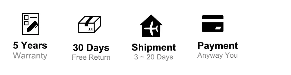 <1> пять лет гарантии (бесплатная замена и доставка); <2> 30 дней вы можете вернуть товар бесплатно; <3> обычно> 10 шт используют EMS/DHL/FedEx/UPS (вы можете получить в течение 3-7 дней); <4> Поддержка почти всех способов оплаты по всему миру (или скажите, что вы хотите).