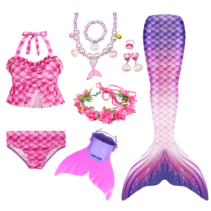 10 шт.: 1 * платье с хвостом русалки + 1 * бюстгальтер + 1 * шорты + 1 * гирлянда + 1 * ластик монофин + 1 * ожерелье + 1 * браслет + 1 * кольцо + 1 пара зажимов для ушей