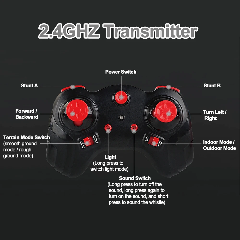 * Функция: вперед/назад, поворот влево/вправо, внутренний/наружный режим, переключатель режима местности, поворот на месте, самобалансирующийся баланс, вращение на 360 градусов, дрейф, ОДНОКОЛЕСНЫЙ стенд, 6-осевой гироскоп.