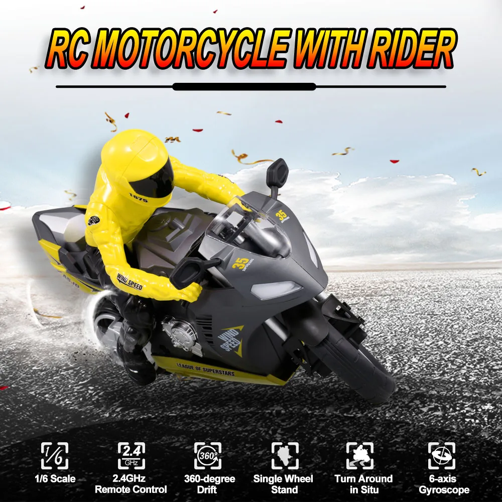 Супер крутой мотоцикл-это 1/6 масштабный автомобиль с дистанционным управлением с 6-осевым гироскопом для достижения различных трюков, таких как подставка для одного колеса, поворот на месте, 360 °, позволяет вам испытать специальные эффекты каскадеров. Он принимает съемного мотоциклиста с изысканными деталями и высокой степенью моделирования, которая может быть статической моделью для отображения. Кроме того, оснащенный мощной перезаряжаемой батареей 7,4 В 1200 мА · ч и надежной системой подвески, она предоставляет множество возможностей для вас, чтобы насладиться радостью вождения и трюков.