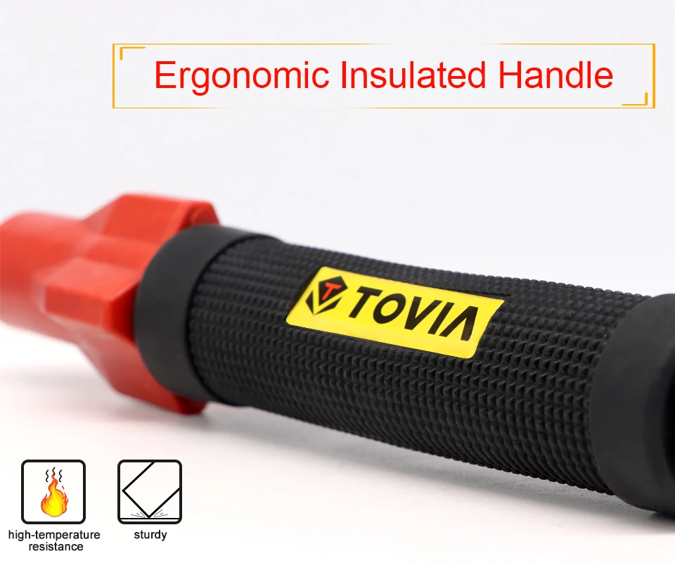 Эркономическая изоляционная ручка комфортно держится в руке при сварочной работе. Это идеально для безопастноити сваршика. Кроме этого она имеете 2 преимущества : термоизоляция и прочность