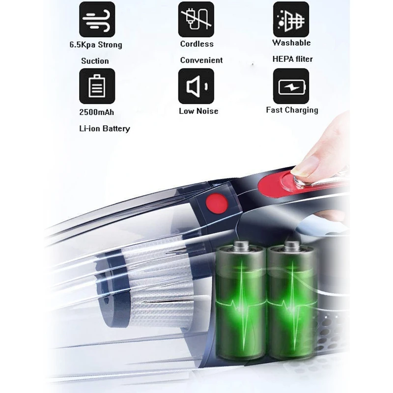 Сильное всасывание: Автомобильный вакуумный беспроводной имеет всасывание 6,5 кПа, он также может очистить те труднодоступные невидимые пылевые моты, такие маленькие, как 0. 3 микрон, глубоко в диванах и матрасах.