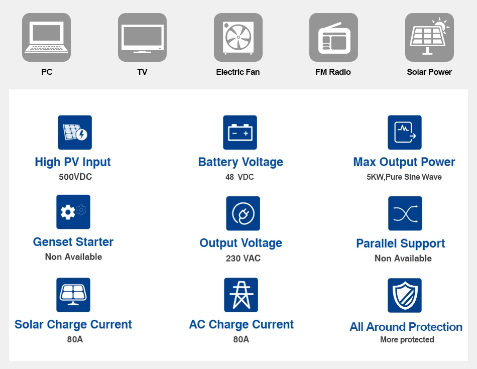 · Чистый синусоидальный Солнечный инвертор · Коэффициент выходной мощности 1 · Функция холодного запуска · Широкий диапазон входного сигнала PV, работает без аккумулятора · Выбираемый ток зарядки высокой мощности · Автоматический перезапуск во время восстановления переменного тока · Защита от перегрузки и короткого замыкания · Настраиваемый AC/Solar вход приоритет через ЖК-настройки · Совместимость с напряжением сети или мощностью генератора · Умный дизайн заряда батареи для оптимальной производительности батареи · Выбор диапазона входного напряжения переменного тока для бытовой техники и личного Компьютеры Бесплатные возвраты: Мы поддерживаем бесплатную доставку в течение 15 дней после получения в 16 странах. Если вы недовольны нашим товаром, свяжитесь с нами, и вы можете вернуть товар без оплаты каких-либо расходов на доставку. Мы предоставим вам полный возврат средств сразу же после получения товара на складе. 16 бесплатных местных возвратов: Россия, Испания, Франция, Польша, Великобритания, Германия, Италия, Нидерланды, США, Канада, Бразилия, Австралия, Израиль, Южная Корея, Саудовская Аравия, объединенные Арабские ЭмиратыМодель