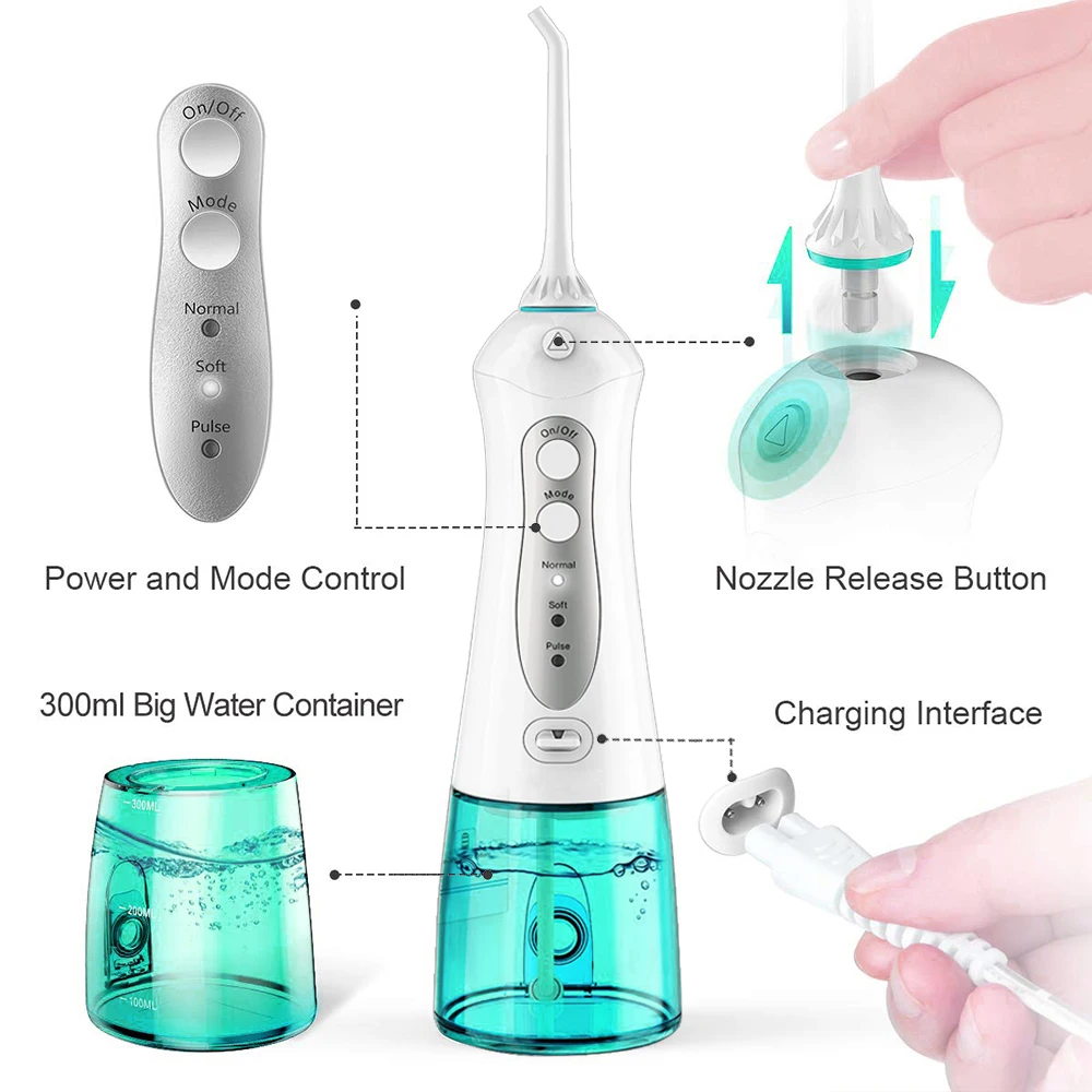 【 Большой герметичный резервуар для воды объемом 300 мл 】очень большой резервуар для воды обеспечивает достаточно бесперебойное Зубное покрытие. Благодаря открытому Баку и съемной конструкции, чистить известковый налет внутри резервуара для ирригатора воды намного проще. 【【 3 Многофункциональный насадки для разных Needs】 Беспроводная Путешествия Водяной Флоссер имеет больше аксессуаров в свой пакет раз по сравнению с другими разъемами. 3 стандартных струйных наконечника, 1 дорожная сумка может хранить все зубные части ирригатора для полости рта, что делает Флоссер для воды портативным. 1 адаптер питания с 1 usb-кабелем для зарядки ирригатора воды. 【 3 режима очистки с функцией памяти. Беспроводные зубные нити для полости рта имеют стандартные, мягкие, массажные режимы со светодиодными индикаторами и низким уровнем шума, которые могут удовлетворить различные потребности полости рта. Это идеальный Электрический водный Флоссер для брекетов. Предустановленный режим перед использованием и Инновационная функция памяти помогает сохранить Предпочтительный режим для следующего использования, даже если портативный Флоссер для воды был выключен 【 Вращающийся на 360 ° струйный наконечник и другие умные floводный Флоссер принимает эргономичный дизайн ручки. Струйная насадка вращается на 360 °, и с 30-100psi диапазоном давления, 1400-1800 раз/мин струя воды импульса, 1400 мАч литиевая батарея, это может помочь удалить 99% от всех зубных налета. USB Перезаряжаемый ирригатор для воды имеет дисплей питания, автоматическое синхронизацию, защиту от перезаряда, автоматическое отключение после 120 секунд использования 【Safe и USB Water водный Флоссер изготовлен из безопасного материала ABS и одобрен IPX7, LFGB, CE, FCC и т. Д. Так что вы можете использовать его безопасно. Встроенный высококачественный литиевый аккумулятор, usb Перезаряжаемый водный Флоссер нужно всего 4 часа зарядки, чтобы прослужить долго 7-10 дней использования (два раза в день)