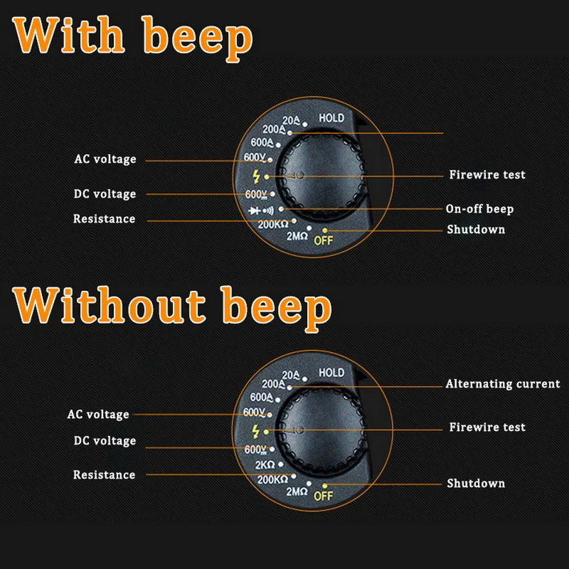 <Многофункциональность: Может использоваться для измерения напряжения, тока, сопротивления, диода, живого провода и зуммера, включая индикацию низкого напряжения, защиту от перенапряжения и функцию удержания данных.
