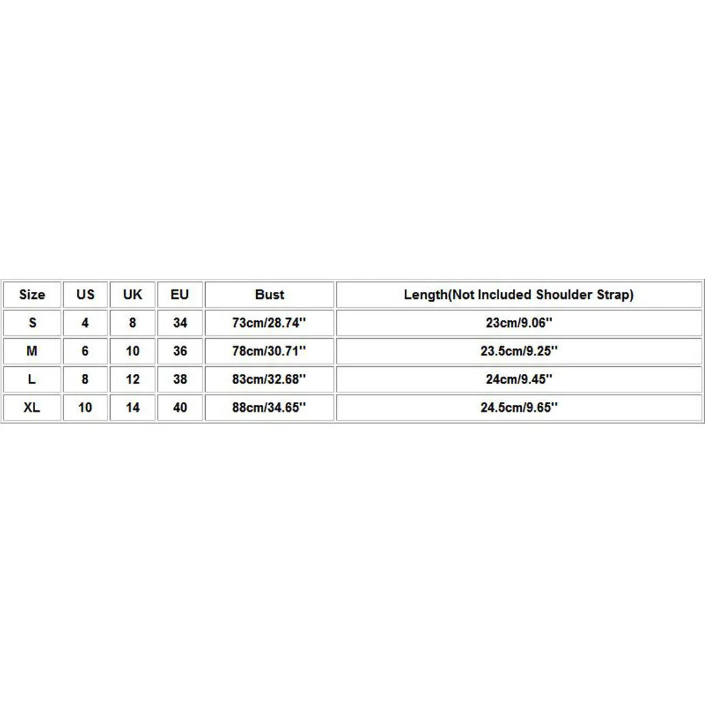 Размеры Свяжитесь с нами Великобритания ЕС Обхват груди Длина (плечевой ремень в комплект не входит) S 4 8 34 73 см/28,74'' 23 см/9,06'' М 6 10 36 78 см/30,71'' 23,5 см/9,25'' L 8 12 38 83 см/32,68'' 24 см/9,45'' XL 10 14 40 88 см/34,65'' 24,5 см/9,65''