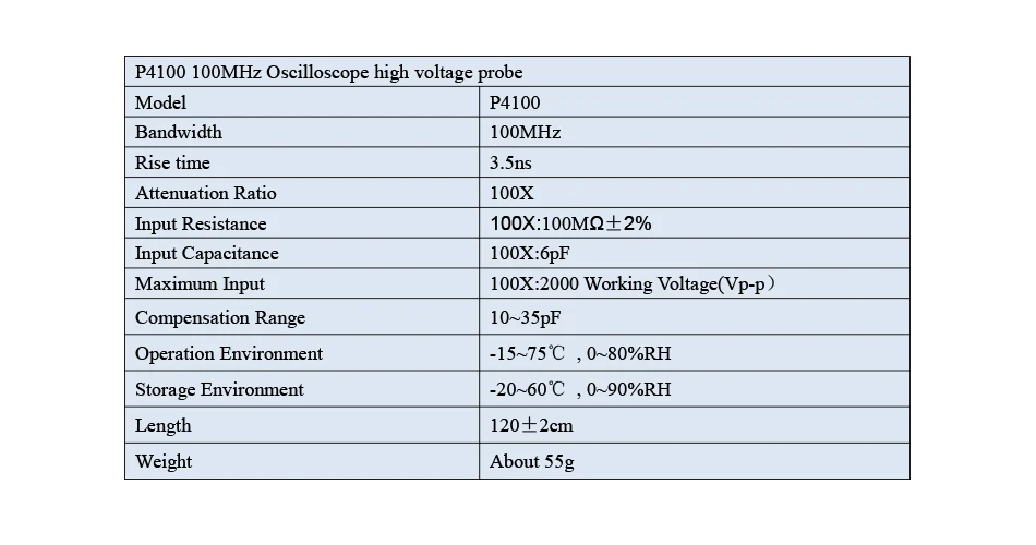Особенности и характеристики: Универсальный 100:1 высоковольтный датчик осциллографа Характеристики: • 100:1 затухание • Входное сопротивление 100 мегомс • Входная емкость 6 pF • Диапазон компенсации: 10 - 35 pF • Полоса пропускания: 100 МГц • Время нарастания: 3,5 ns • Максимальное рабочее напряжение: 2 кВ (Vp-p) • Длина: 1,2 метров Посылка включает в себя: 1 * P4100 зонд 2 * колпачки 8 * цветные круги 1 * Инструмент регулировки 1 * пружина