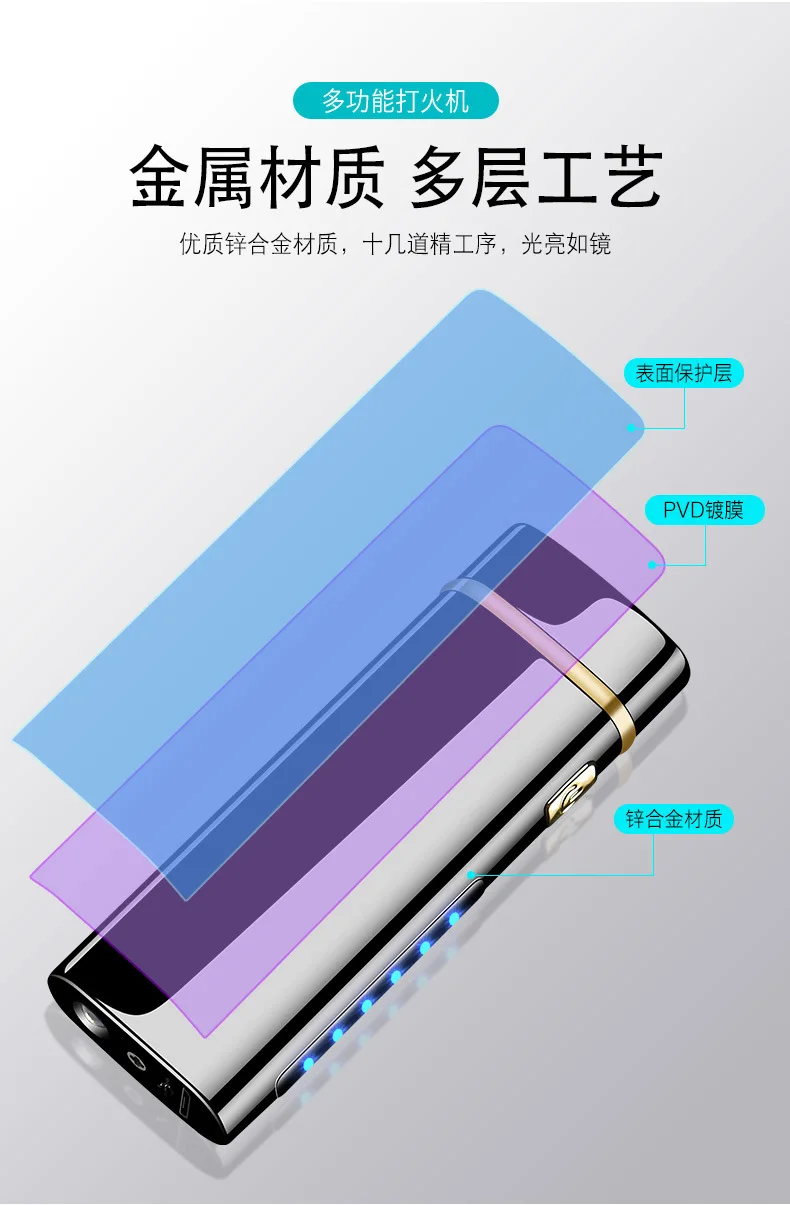 Двойное зажигание дуги и светодиодный светильник Основные характеристики: двойное дуговое зажигание, USB2.0, аккумулятор большой емкости, безопасный без открытого пламени, светодиодное освещение, открытый ветрозащитный, умный чип, дисплей питания.
