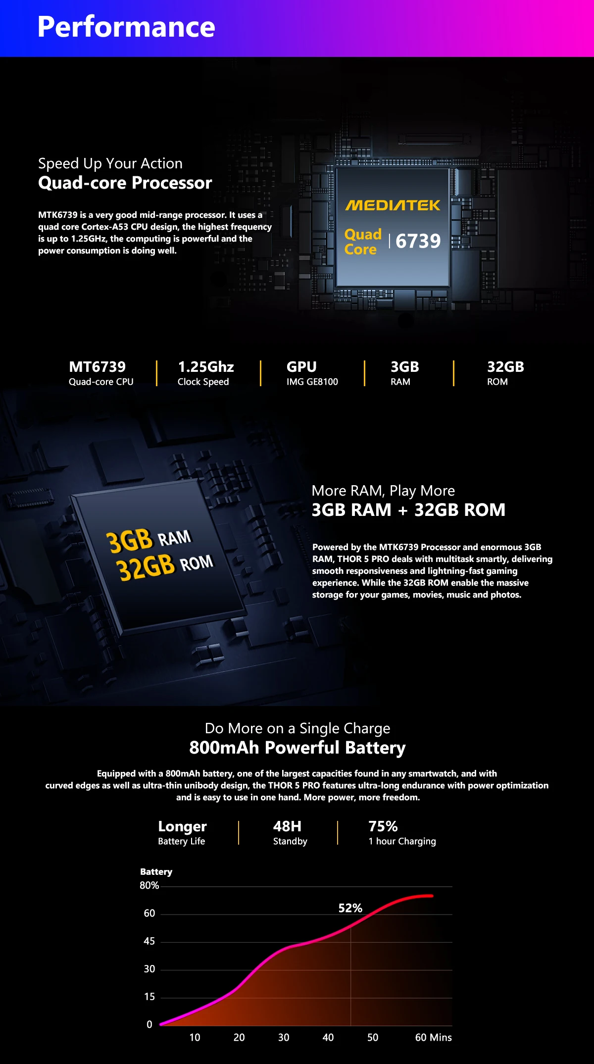 Четырехъядерный процессор MTK6739-очень хороший процессор среднего радиуса действия. В нем используется quad core Cortex-A53 Процессор дизайн, самая высокая частота до 1,25 ГГц, вычислительная мощный и потребеление энергии все хорошо. 3 ГБ ОЗУ + 32 Гб ПЗУ Процессор THOR 5 PRO, работающий на процессоре MTK6739, с большим объемом оперативной памяти 3 ГБ, хорошо справляется с многоцелевой работой, обеспечивая плавное реагирование и быстрый игровой процесс. 32 Гб ПЗУ обеспечивают массивное хранилище для игр, фильмов, музыки и фотографий. Процессор-MT6739 четыре ядра 1,25 ГГц-часы Скорость GPU - IMG GE8100 3 ГБ ОЗУ + 32 Гб ПЗУ Мощный аккумулятор 800 мАч Оснащенный аккумулятором 800 мА · ч, одним из самых больших мощностей, которые есть в любых умных часах, с изогнутыми краями, а также ультратонким цельным дизайном, THOR 5 PRO имеет сверхдолгую выносливость, оптимизируя электроэнергию, и прост в использовании одной рукой. Больше энергии, больше свободы. -Более длительный срок службы батареи -48 часов в режиме ожидания -1 час зарядки 75%