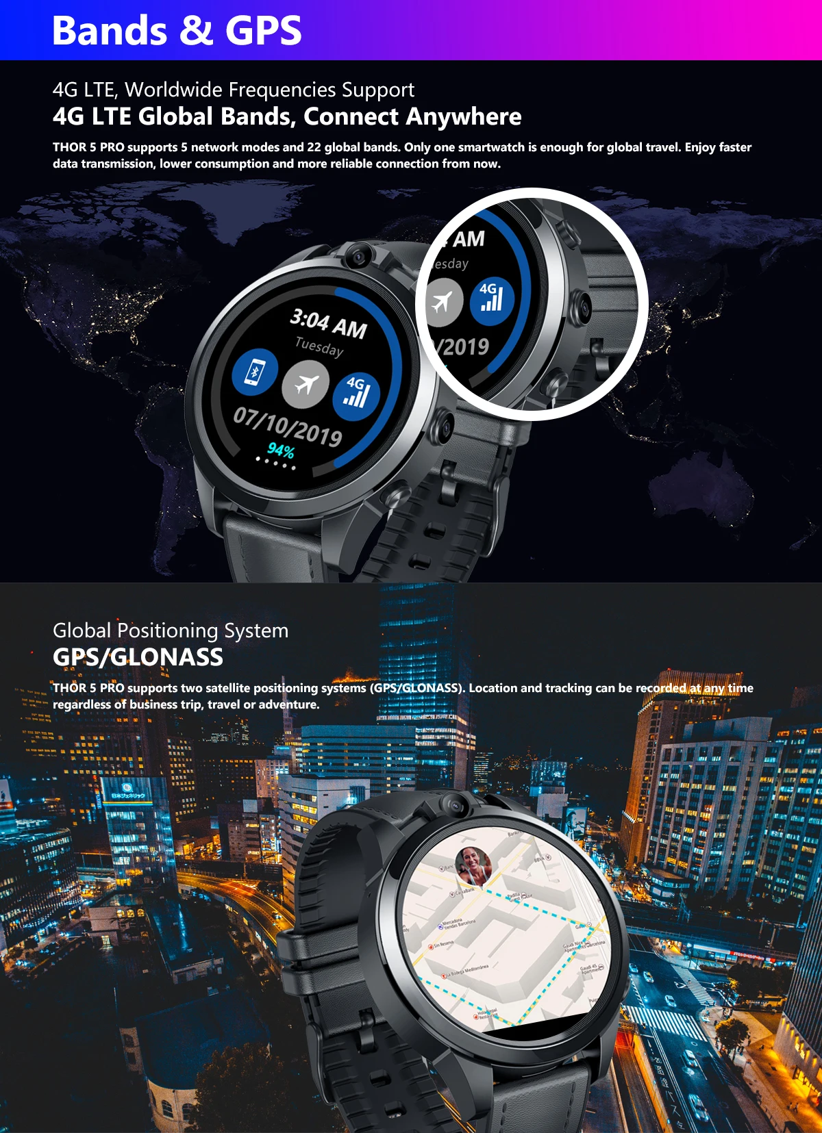 4G LTE Global band, подключается к любой точке THOR 5 PRO поддерживает 5 сетевых режимов и 22 глобальных диапазона. Для путешествий по всему миру достаточно только одного smartwatch. Наслаждайтесь более быстрой передачей данных, более низким энергопотреблением и более надежным подключением с этого момента. GPS/ГЛОНАСС THOR 5 PRO поддерживает две системы спутникового позиционирования (GPS/GLONASS). Местоположение и отслеживание могут быть записаны в любое время, независимо от деловых поездок, путешествий или приключений.