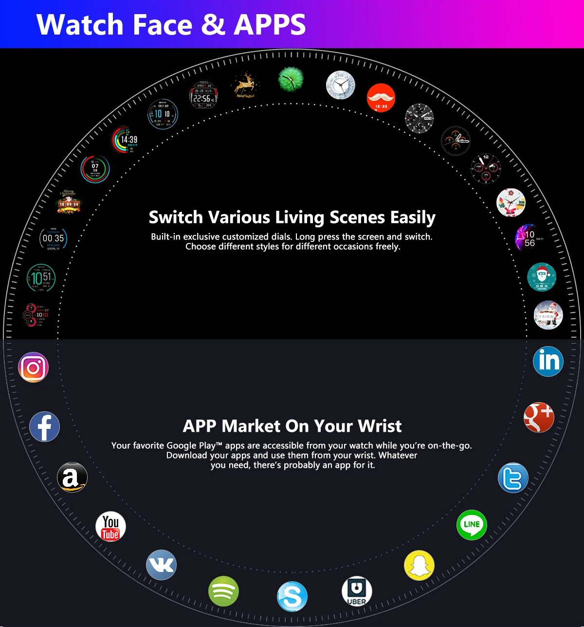 Легко Переключайте различные живые сцены Встроенные эксклюзивные индивидуальные циферблаты. Нажмите и удерживайте кнопку нажатой на экране. Выбирайте разные стили для разных случаев. Рынок приложений на запястье Ваш любимый Google Play™Приложений доступны от ваших часов, в то время как вы on-the-go. Скачайте свои приложения и используйте их с запястья. Что бы вам ни было нужно, для этого, вероятно, есть приложение.