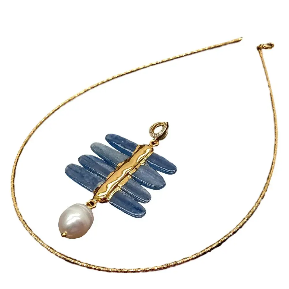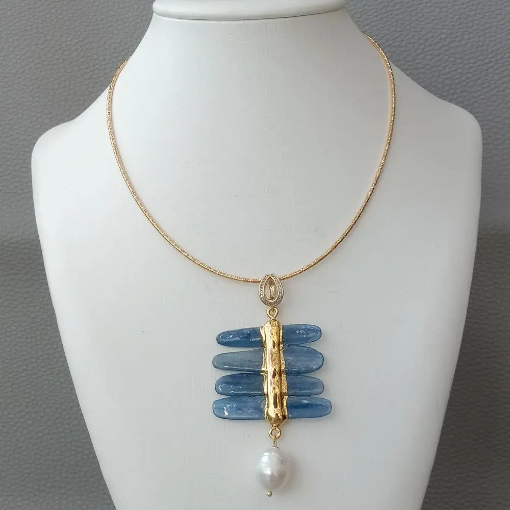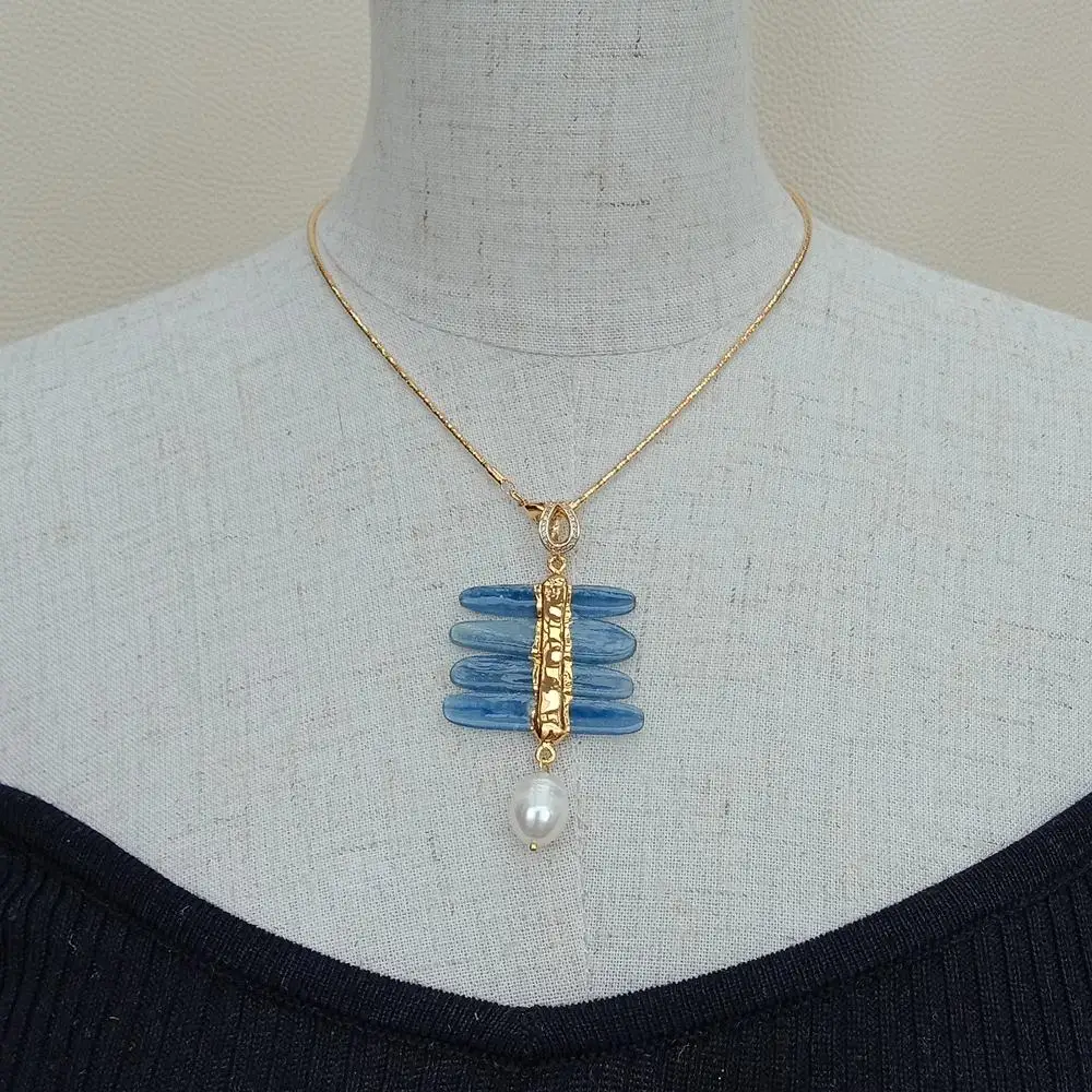 Информация о драгоценных камнях: Подвеска из натурального каплевидного синего кианита, белый жемчуг в форме риса, хорошее качество, яркий блеск!