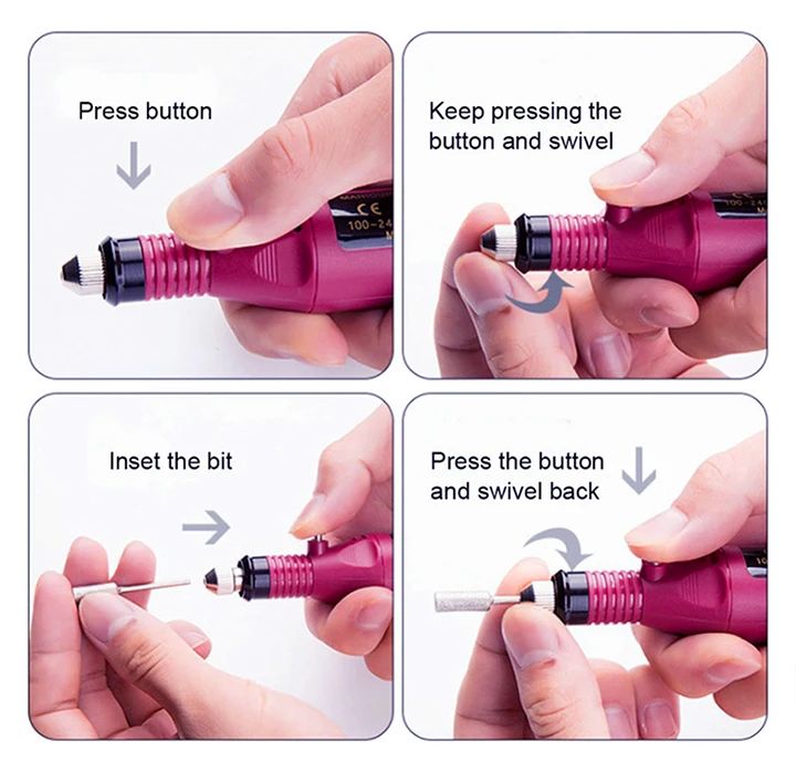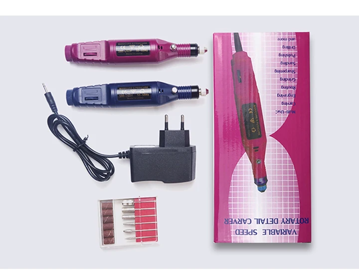 1 x электрическая пилка для ногтей сверлильный станок (источник питания и контроль) 1 х наконечника 1 х педаль управления питанием 6 сверл для шлифования металла 6 шлифовальных лент 1 x Руководство пользователя