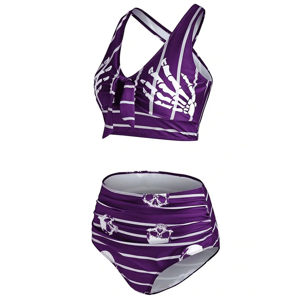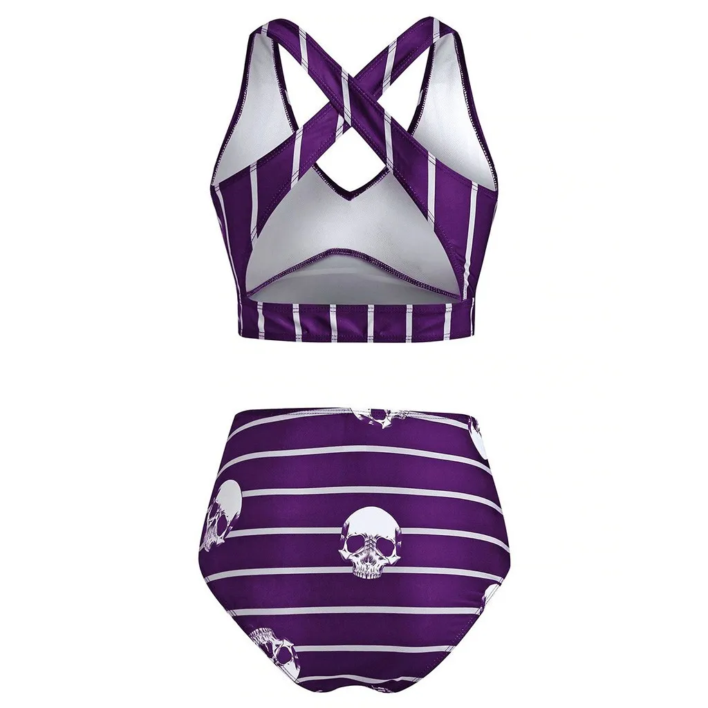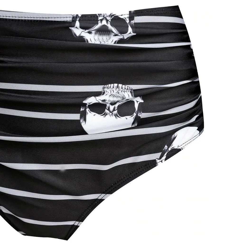 Women Push-Up Padded Bikini Skull Striped Print Cut Out Padded Tankini Set