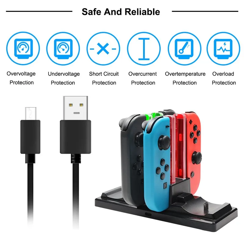 Этот товар может заряжать 4 джойстика или 1 Профессиональный контроллер и 2 джойстика одновременно. Простой дизайн скольжения и подключи и работай. Безопасный и прочный, безопасный с перезарядкой или защитой от короткого замыкания.