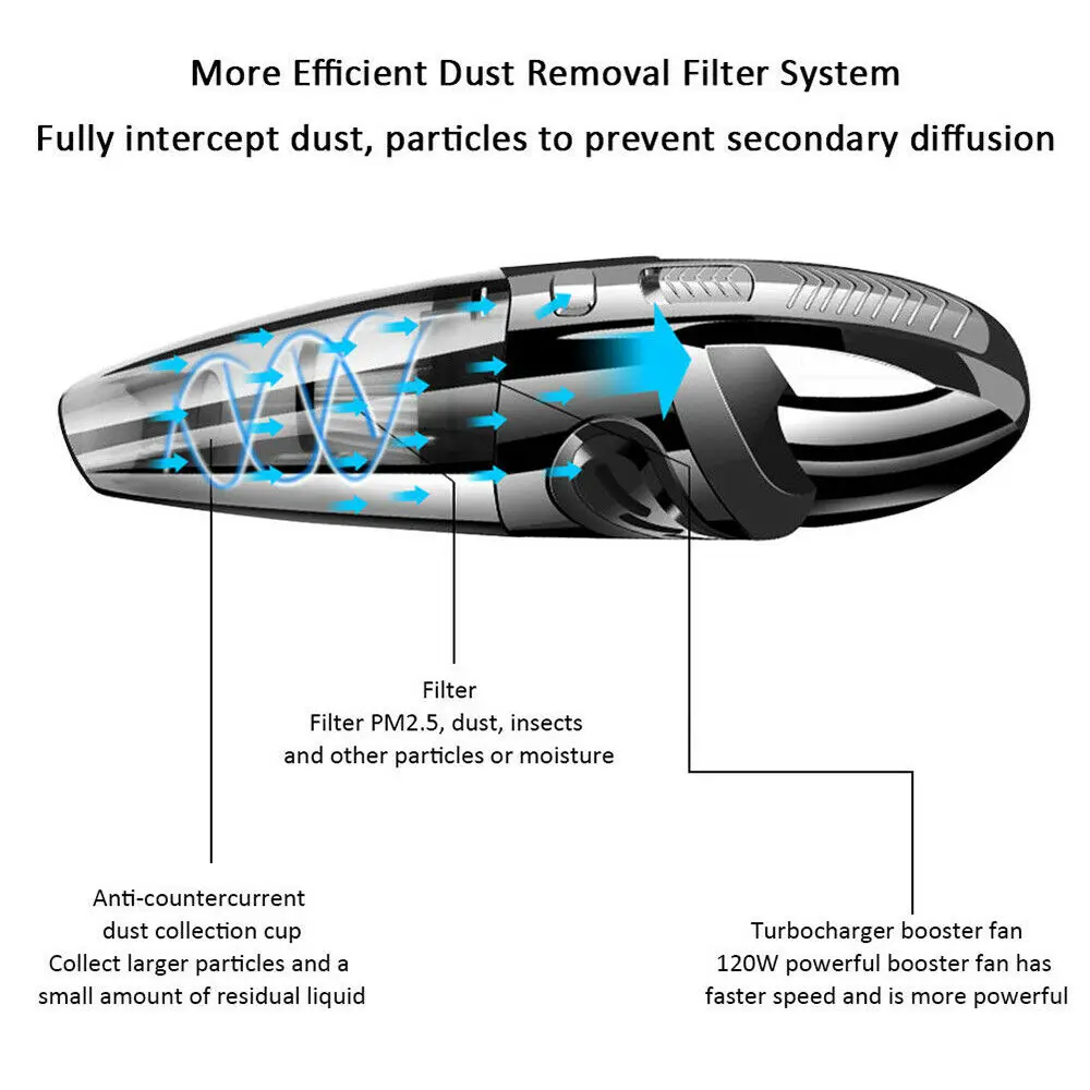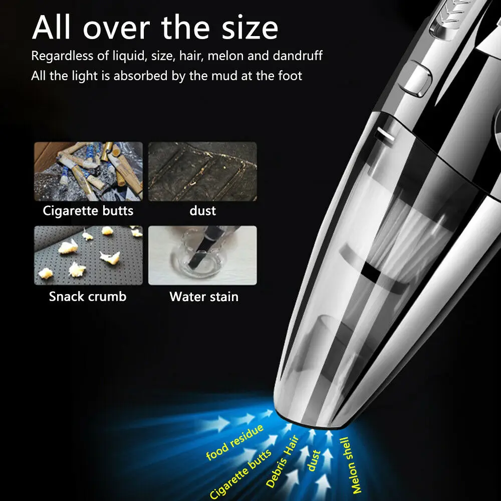 1. The filter must be installed when using 2. Do not direct in the sun, do not use in high temperature and high pressure places 3. Do not use gasoline or volatile detergent to wipe the body 4. The front case must not be taken when the motor rotates. 5. This product is a vehicle tool. It is forbidden to use it alone to avoid danger. 6. Pay attention to the water level of the front cover when absorbing moisture 7. When clearing the foreign matter in the gap, please put on the duckbill straw. 8. Under normal conditions, usually can be used for half an hour, and has no effect on the car battery 9. When the product is finished, please turn off the switch. * When removing the object from the net bag, press the fastening button and then pour off the foreign object. 10. In order to make the vacuuming effect better, it is necessary to clean the filter bag regularly. * When the vacuum cleaner is not used, the power cord can be rolled up and stored.