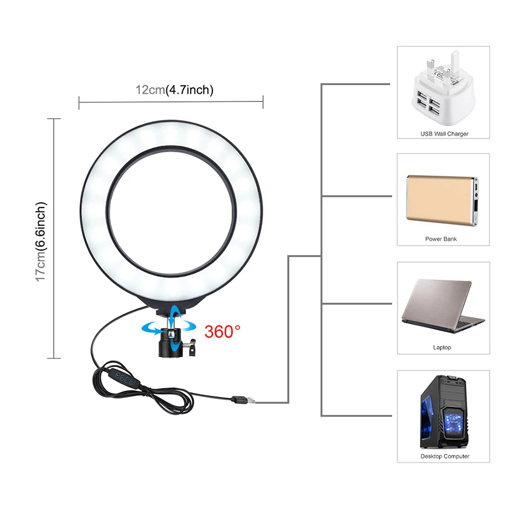 -Светодиодный кольцевой светильник можно установить на держатель и взять его в любом месте, его также можно снять с подставки в любое время, шаровая Головка штатива может вращаться на 360 градусов, можно свободно регулировать под любым углом (держатель не входит в комплект).