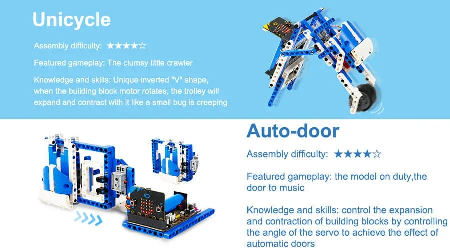 1. Разработано на базе BBC Micro:bit, оснащено профессиональной расширительной платой Super:bit. 2. Программирование MakeCode + программирование Python, подходит для пользователей разных возрастов. 3,16 видов моделей строительных блоков + полноцветная печать, руководство по эксплуатации проекта. 4. Поддержка пульта дистанционного управления с управлением приложениями/играми-при использовании различного оборудования, чтобы общаться со строительными блоками, пользователь может испытать удовольствие, вызванное технологией. 5. Совместим со строительным блоком Lego, различными играми.