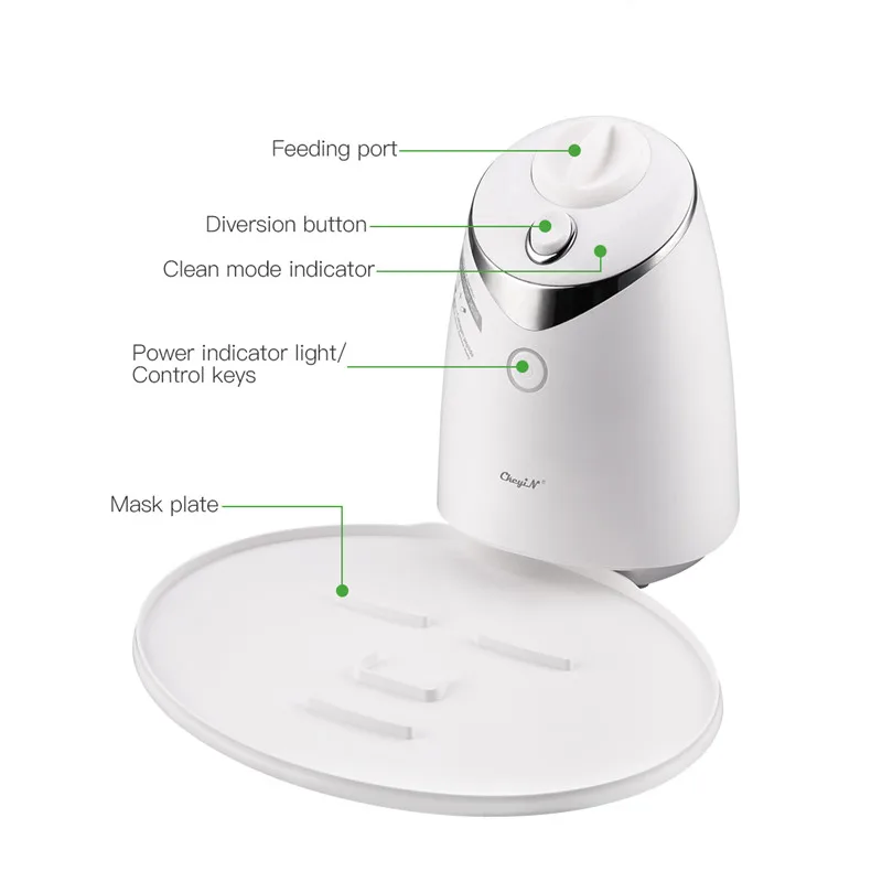 1. Продукт имеет функции интеллектуальной голосовой подсказки, подсказки уровня воды и автоматической очистки, которая удобна и проста в использовании. 2. Внутренняя часть машины изготовлена из металла и керамических материалов, что является экологически чистым и безопасным. 3. Маска машина тихая, автоматическая и проста в эксплуатации, только одна кнопка питания для управления всеми программами. 4. Маска будет образована равномерно автоматически на пластине маски ABS, только заливая жидкость, нет необходимости в бумажной маске и нет необходимости иметь ложку для его формирования. Убедитесь, что маска более идеальна и лучше подходит для кожи лица. 5. Вы можете сделать маски в зависимости от вашей кожи, DIY различные виды масок для лица, заливая сок фруктов и овощей, молока, меда и эфирных масел, трав, цветов, яиц и т. Д.