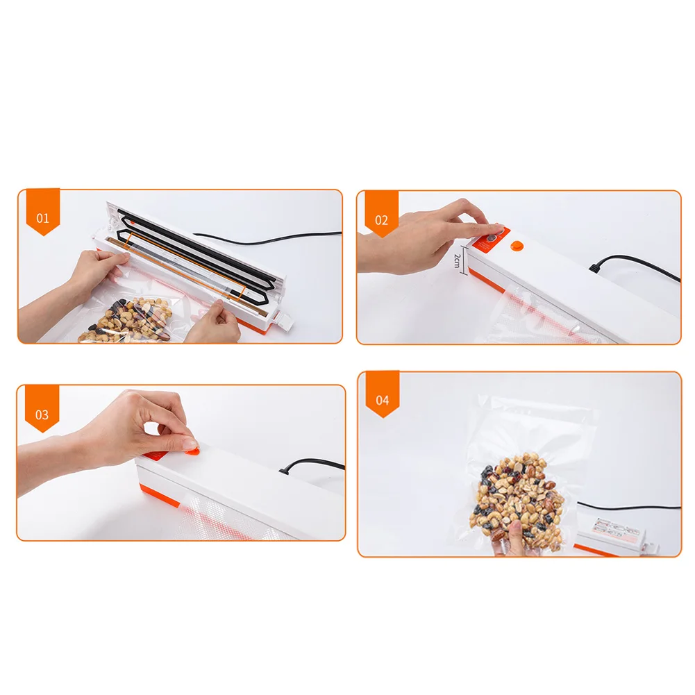 -Машина для запечатывания пищевых продуктов может быстро сливать воздух вокруг продуктов, что помогает сохранить большинство фруктов, овощи и травы в течение нескольких недель в холодильнике или месяцев в морозильной камере, чтобы уменьшить порчу и пищевые отходы.