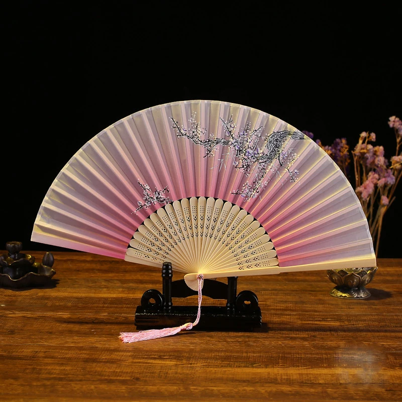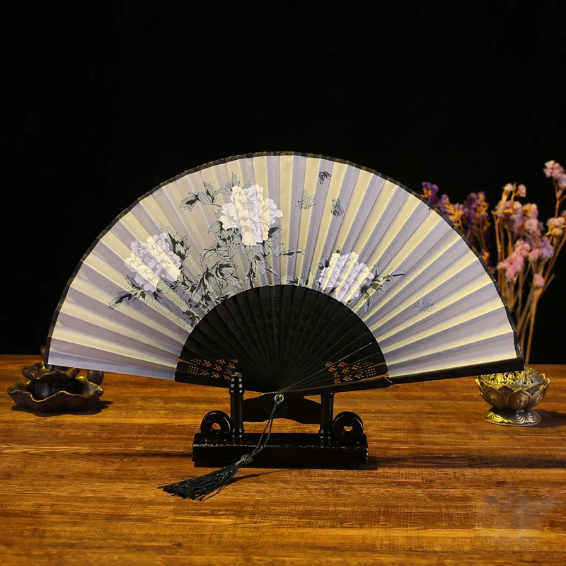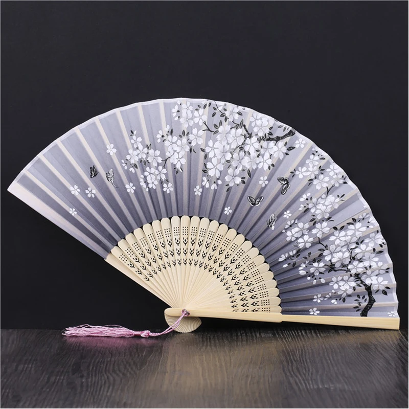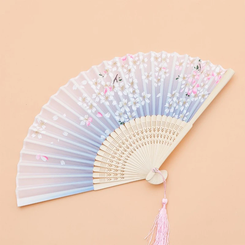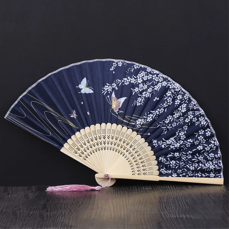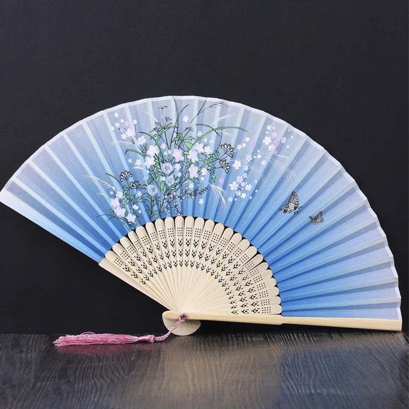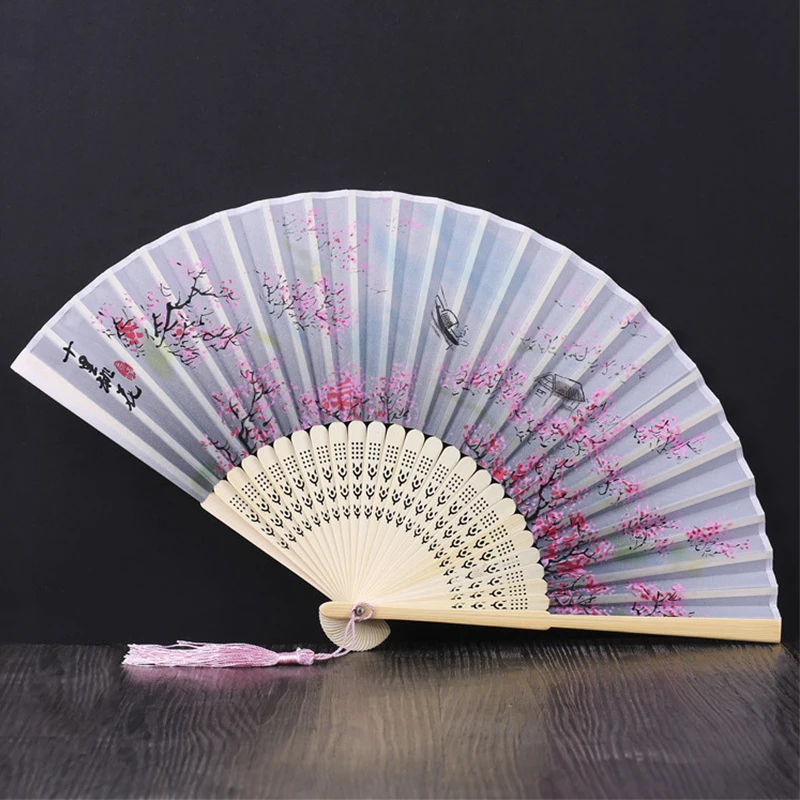 Китайский Японский складной веер с деревянным хвостовиком, Классический танцевальный веер, высококачественный Элегантный женский веер с кисточками