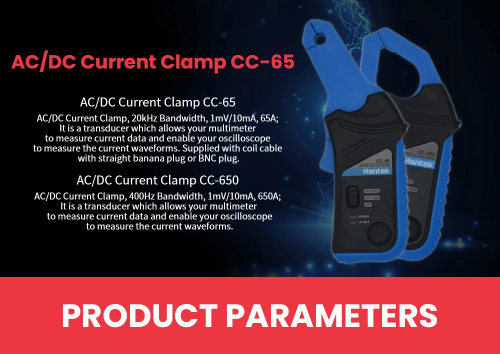 Токовый зажим переменного/постоянного тока, полоса пропускания 20 кГц, 1 мВ/10 мА, 65 А; Это преобразователь, который позволяет мультиметру измерять текущие данные и давать возможность осциллографу измерять текущие формы волн. Поставляется с кабелем в катушке с прямым штекером типа банан или штекером BNC.