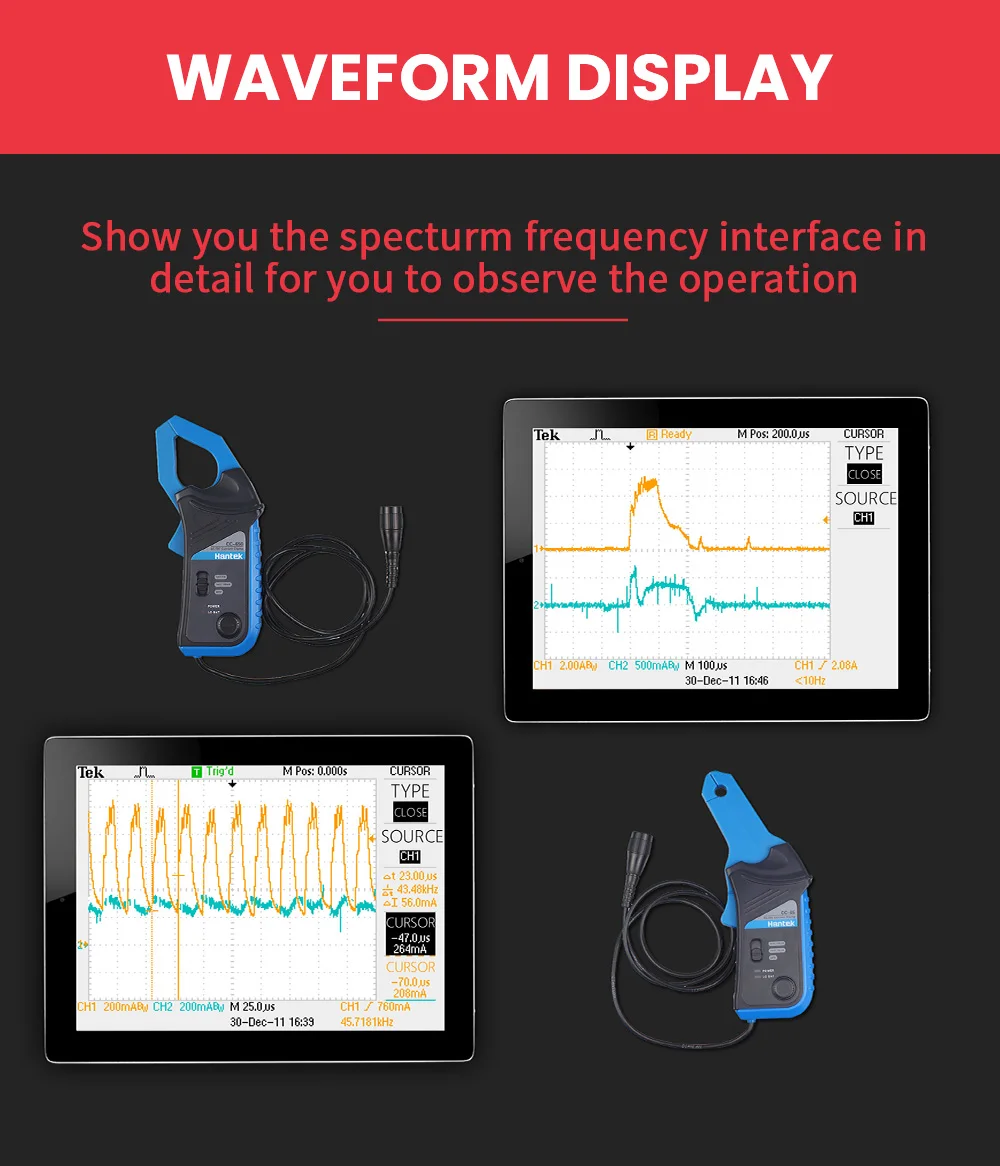 Его преобразователь тока состоит из permalloy и элемента холла, которые линейно преобразуют переменный или постоянный ток в переменный или постоянный ток напряжения. А при подключении к осциллографу с помощью разъема типа BNC можно наблюдать за текущими формами волн; При подключении к мультиметру с помощью разъема типа банан можно получить текущие данные.