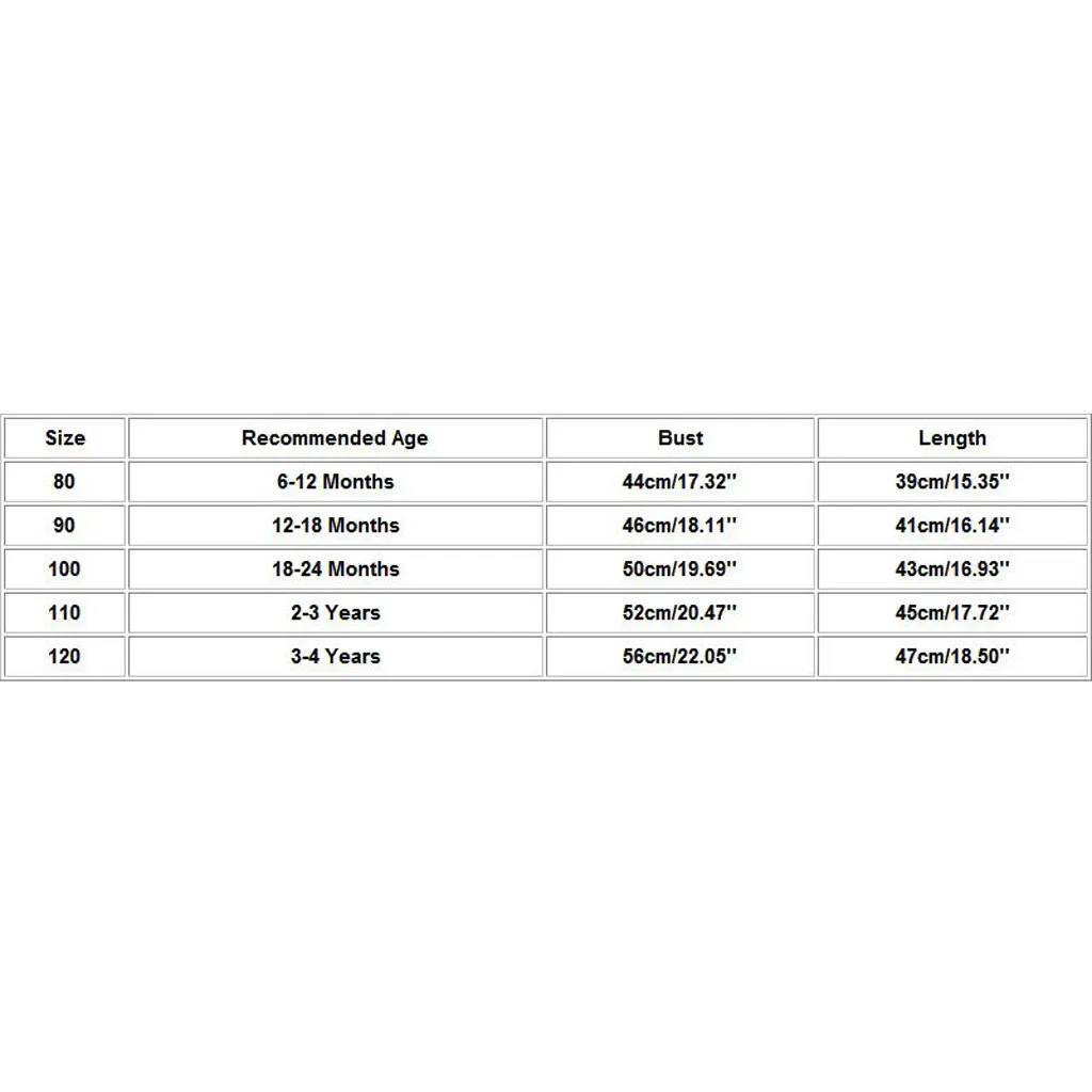 Размер Рекомендуемый возраст Бюст Длина 80 6-12 месяцев 44 см/17,32'' 39 см/15,35'' 90 12-18 месяцев 46 см/18,11'' 41 см/16,14'' 100 18-24 месяцев 50 см/19,69'' 43 см/16,93'' 110 От 2 до 3 лет 52 см/20,47'' 45 см/17,72'' 120 От 3 до 4 лет 56 см/22,05'' 47 см/18,50''