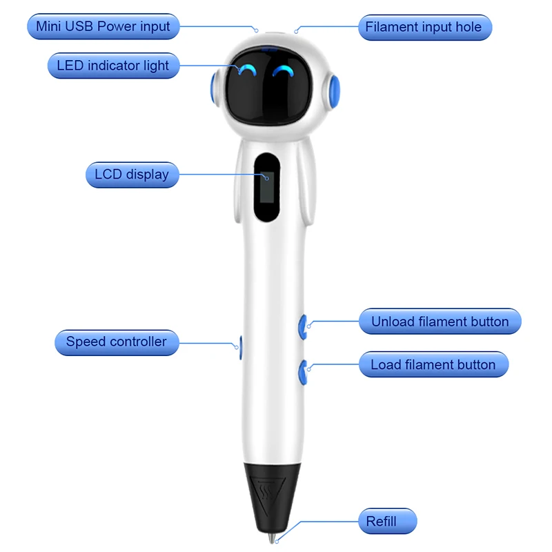 С режимом PLA/ABS, скоростью 1-3 и соответствующими температурами, 3d-ручка UnityStar плавно выдавливает нить для вашего проекта, подходит для школы, дома и на рабочем месте. Привлекательная форма космонавта и экологически чистый материал ABS делают очаровательную ручку, развивая творческие способности ребенка и снимая давление взрослых. Просто Освободите свое воображение и Создайте свою работу для глаз.