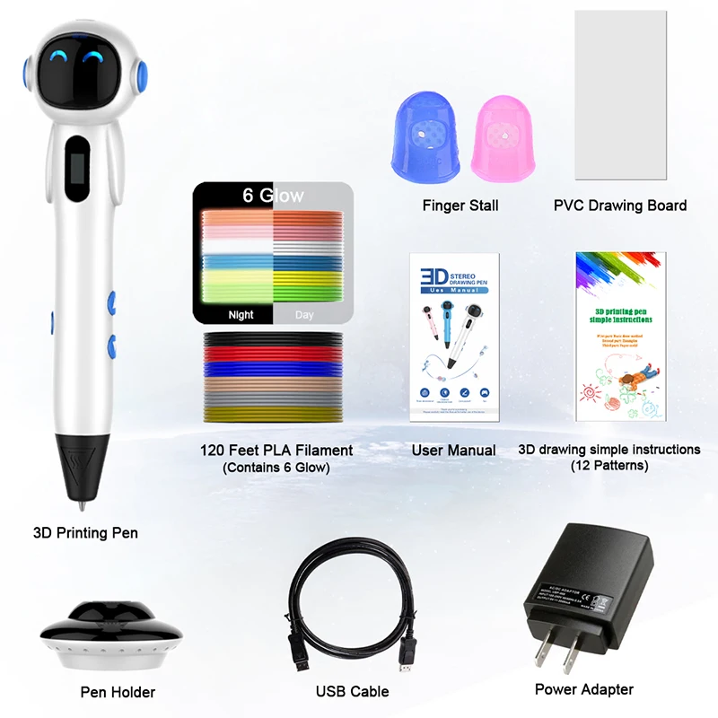 1 * 3D ручка 1 * держатель для ручки 1 * 3D шаблон для рисования 1 * доска для рисования из ПВХ 1 * пятиязычное Руководство пользователя 1 * Мощность адаптер 1 * USB кабель 2 * Защитный чехол для пальцев 12 * PLA нити (6 разных цветов + 6 светящихся цветов)